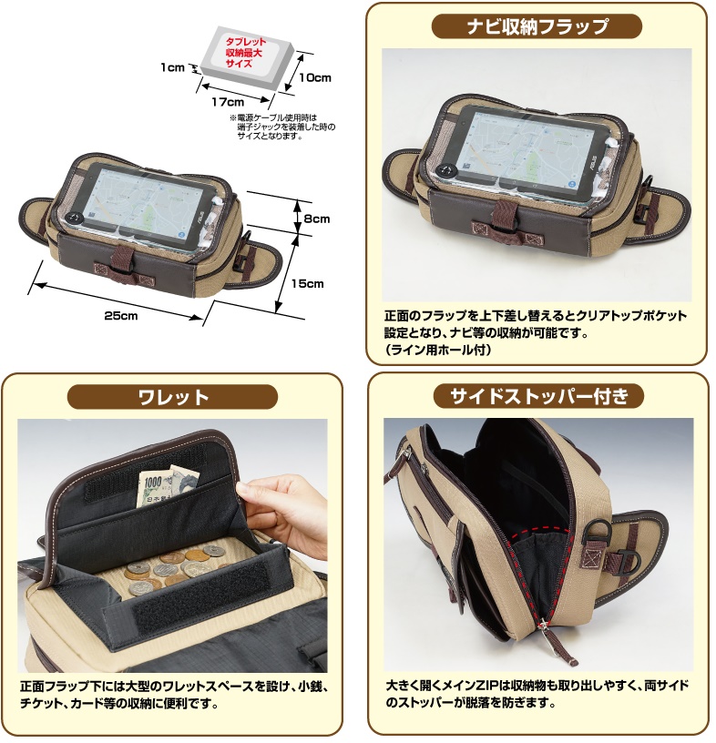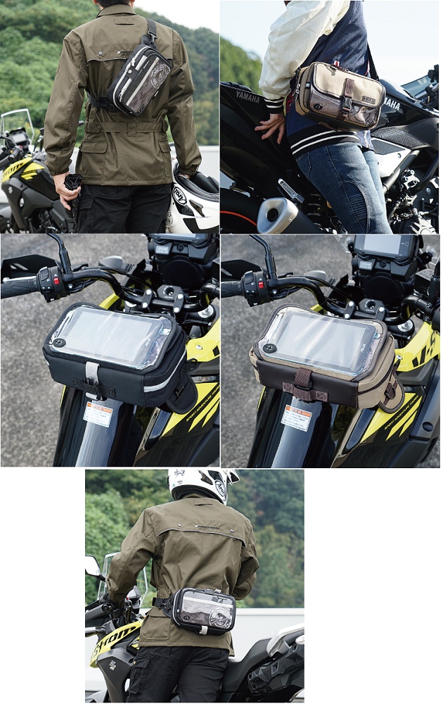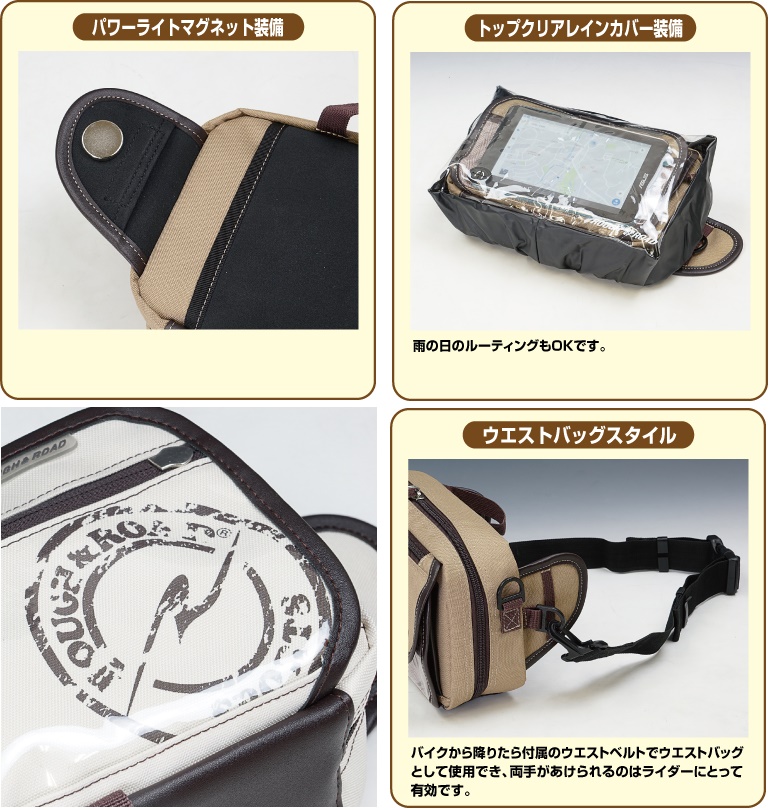 タンクバッグにもウエストバッグにもなる2WAYバッグバイク乗車時は8inまでのデバイスが収納可能なNAVIタンクバッグとして、バイクを降りればウエストバッグとして使用できる、使い勝手がよくファンクショナルでファッショナブルな2WAYバッグです。タンクバッグとして使用するときはフロント面をトップクリアのNAVIスペースにし、その下にグローブをしたままでもコインの取扱のし易い大きなコイン収納スペースを用意。バイクを降りた後はフロント面を上下入れ替えることでウエストバッグに早変わり。シーンに合わせた使い勝手の良さが最大の魅力です。メインスペースにはカード収納スリット、ペン収納、小物ポケット、大型スリットとバッグ内の仕分けもし易い多彩なポケットを用意。身の回りの貴重品収納に最適です。トップクリアスペースのベース部分にカモ柄など個性豊かなデザインを施しました。容量: 2.8リットルSIZE: W25×D15×H8cm(最大)【機能】パワーライトマグネット装備タブレット対応ジャックホール装備インナーフレーム飛散防止ベルト装備トップクリアレインカバー装備【付属品】トップクリアレインカバー×1(RR9461-1 1個)ウエストベルト×1(RR9461-2 1本)パワーライトマグネットIII×2 (RR9964 1個)飛散防止ベルト×1(RR0017 1本)