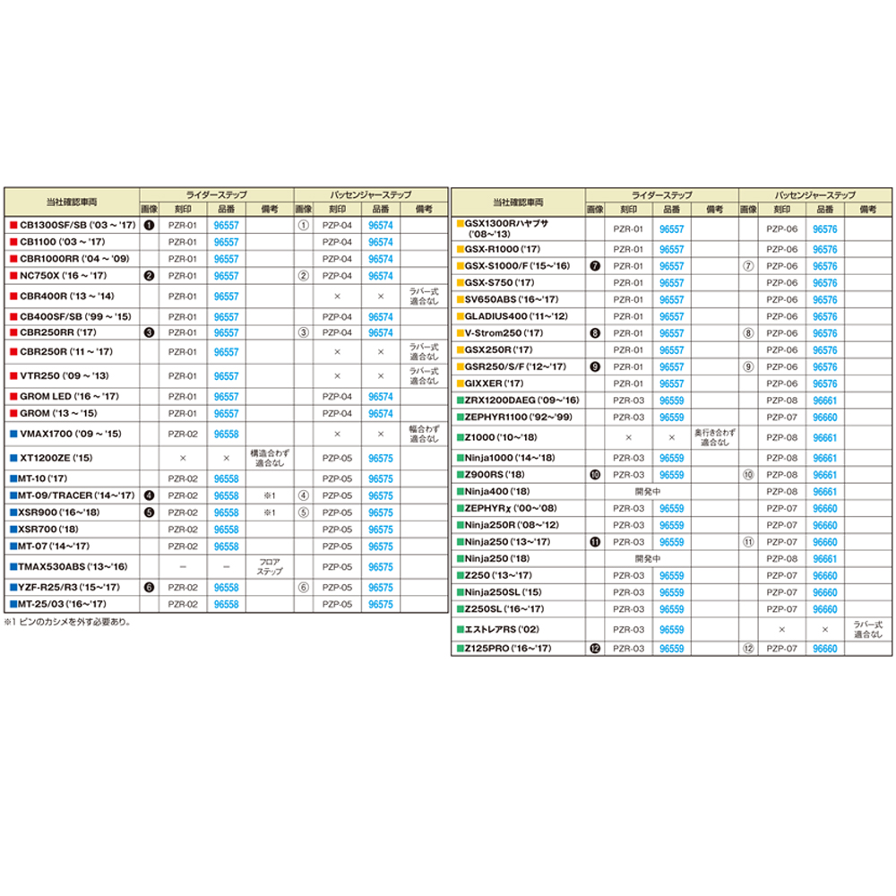 「創」と「麗」を極めた逸品 【PREMIUM ZONE】シリーズにステップセットが登場。・丁寧な切削加工により作り上げられたステップバーはブラック&アッシュシルバーのデュアルアルマイト仕上げ。・ステップバー側面とホルダー上面にレーザーマーキングを施し、存在感をさりげなく主張。・付属リングの組み合わせにより計3色の組み合わせが楽しめます。付属リング:レッド、ゴールド※製品の特性上、端面が鋭くなっております。ケガをする恐れがありますので取扱いには十分ご注意ください。装着後もむやみに素手等で触らないようにしてください。※製品の特性上、端面が鋭くなっております。状況によってはレインウエア等が触れると、ウエア側が破損する恐れがありますので十分ご注意ください。 なお、破損した相手物に関しまして保証はいたしかねますのであらかじめご了承ください。※製造工程の特性上、ステップバー内側に着色時の電極跡やエア溜りによる色ムラが発生します。ステップバー内側の色ムラに関しましては製品不良ではなく仕様となりますので、あらかじめご了承ください。※取り付けにあたって純正部品を再使用する場合があります。特にEリング、スプリング、スチールボール等は紛失しやすいので十分にご注意ください。※初回生産分につきまして表面処理後の追加工を行なっており、タッチアップ仕上げとなっております。あらかじめご了承ください。※補修部品は細かく設定しております。詳しくは2018年カタログP229をご参照ください。【適合参考車種/年式(記載以外の車両に関しましては適合未確認です。ご注意くださいませ)】ライダー側:CB1300SF(03-17)、CB1300SB(03-17)、CB1100(10-17)CBR1000RR(04-09)、NC750X(16-17)、CBR400R(13-14)CB400SF(99-15)、CB400SB(99-15)、CBR250RR(17)CBR250R(11-17)、VTR250(09-13)、GROM_LED(16-17)GROM(13-15)、GSX1300Rハヤブサ(08-13)、GSX-R1000(17)GSX-S1000/F(15-16)、GSX-S750(17)、SV650ABS(16-17)GLADIUS400(11-12)、V-STROM250(17)、GSX250R(17)GSR250/S/F(12-17)、GIXXER(17)