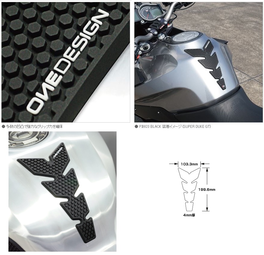 HDR(High Definition Rubber)を使った高いグリップ力とクッション性が魅力のタンクパッド フィッシュボーン スモールサイズ SIZE 199mm×103mm 4mm厚4mmもの厚みのあるヘキサゴンにかたどった凸部で、高いグリップ力とプロテクション性を実現。パッドは凹凸をつけたことで柔軟性が向上しタンクの曲面にも密着しやすく貼り付け汎用性にも優れます。イタリア生まれのかつて無いデザイン性とグリップ力とプロテクション性を備えた新感覚タンクパッドです。SIZE: 199mm×103mm 4mm厚