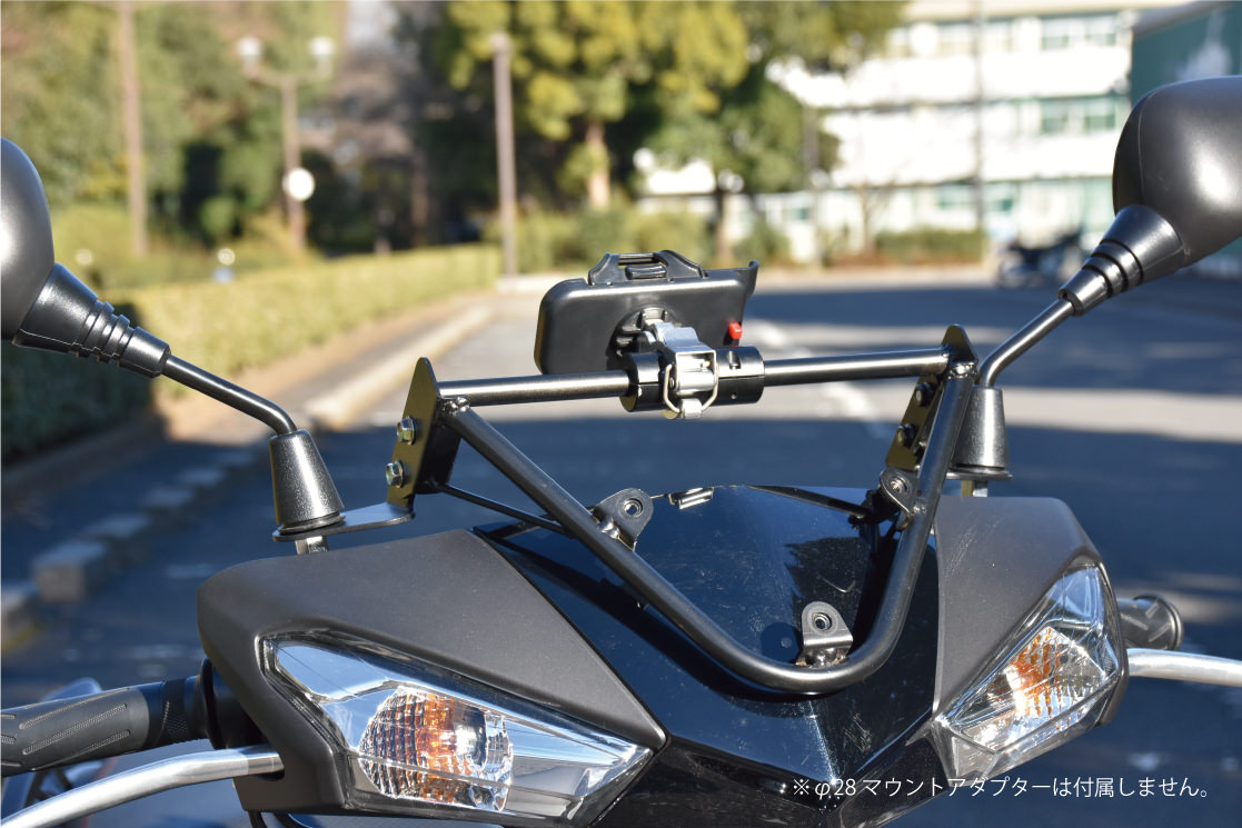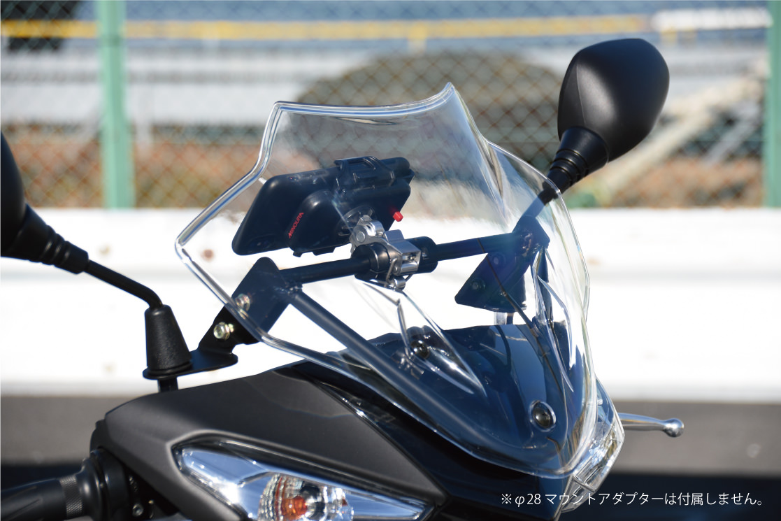 スクリーンカラー:クリアスクリーンサイズ:W395×H325mm素材:ポリカーボネイト(TEIJIN)スクリーン厚さ:3mmステー:スチール 半艶黒塗装作業時間:0.5h付属品:マニュアルφ28マウントアダプター取付可能(別売りオプションとなりますご注意くださいませ。)スクリーン素材にポリカーボネイトを使用した「スマートフォンマウントSPORTスクリーン」。計算された3次元形状は小振りながら優れたエアロ効果と高い耐久性を発揮します。またスマートフォンをはじめとする各種電子機器をフレームへ装着可能にし、 進行方向⇔メーター(計器類)⇔ナビ間での視線移動を最小限に抑えます。無加工で装着可能なボルトオン設計です。【ウインドスクリーンについて】素材にはTEIJIN製ポリカーボネイトPanliteを使用しています。衝撃特性、透明性といった点で優れた特性を持ち、天候や季節を問わず安定した性能を発揮します。【専用フレームについて】スクリーンを取り付けるためのステーは、パイプと無垢材を使ったフレーム構造を採用しました。肉厚1.6mmのスチールパイプを使うことで軽く、そして強度に優れた設計です。振動に強くスマートフォンを取り付けた状態でも安定した視認性を可能にします。表面処理には艶消し黒塗装を施しました。