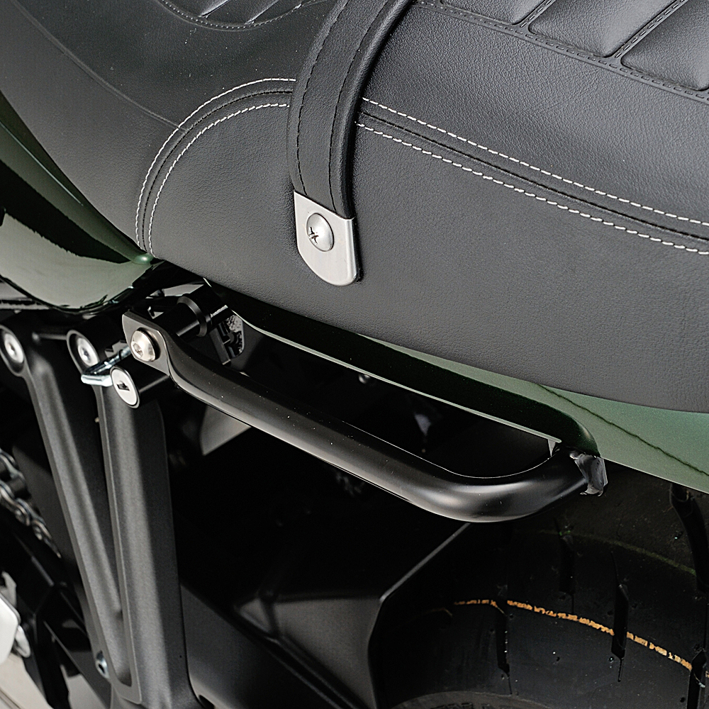 往年の名車「Z2」テイストに仕上げるためのアシストグリップです。バイクの取り回しが楽に行なえるようになります。グリップ前側のカラーを段付き形状にすることで、ネットフック等が引っかけ易くしています。φ15.9パイプ使用スチール製電着黒塗装仕上げ※右側のみの1個売りです。