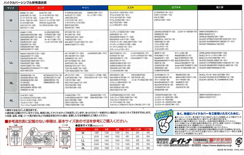 ・エアベント機構:左右ミラー部のエアベント機構が、湿気を排出します。・前後判別:チェーンホールのフロント側を赤、リア側を黒に分けて前後の判別ができます。・後縛りひも:後部から裾を絞ることで、裾のめくれを防止します。・溶けない耐熱パッド:耐熱性コットンパッド付属。マフラーなど高温部に貼り付けることで、バイクカバーが溶けることを防ぎます。・風飛び防止センターベルト:車体横で固定できるので、地面に膝をついてベルトを装着する必要がありません。・大型ロック対応:前後に大型ロックに対応したチェーンホール(幅85mm)装備。カバーをめくってロックする必要がありません。カラー:ブラックサイズ:3L※生地表面にはっ水性のコーティングを施してありますが、完全防水ではありません。雨量・使用状況によっては浸み込む場合があります。また、特性上経年劣化によって防水性が著しく落ちます。あらかじめご了承ください。※耐熱パッドを貼り付けた部分でも、高速走行・高回転を多用するハードな走行直後は、マフラーが300℃以上の高温となり、表面まで熱が伝わる恐れがありますので、少し冷ましてからカバーを掛けてください。※車種適合表に記載されているサイズは、車両に対してタイトなサイズを表示しています。ゆったりカバーを被せたい場合は、1つ大きいサイズをおすすめします。【適合参考車種】X4、レブル250/500、Vツインマグナ 、XT1200Z Super TENERE、BOLT、TMAX500XV400、ドラッグスター250、マジェスティ、デスペラード400/800エリミネーター400、エリミネーター250、ZZR1100/ZZR1200/ZZR1400ZRX1100/1200/DAEG、ゼファー1100/1100RS、ゼファー750/750RSW650/W800BMW K1300R、BMW K1300S、BMW R1200R、BMW R1150RBMW F800ST、HD スポーツスター