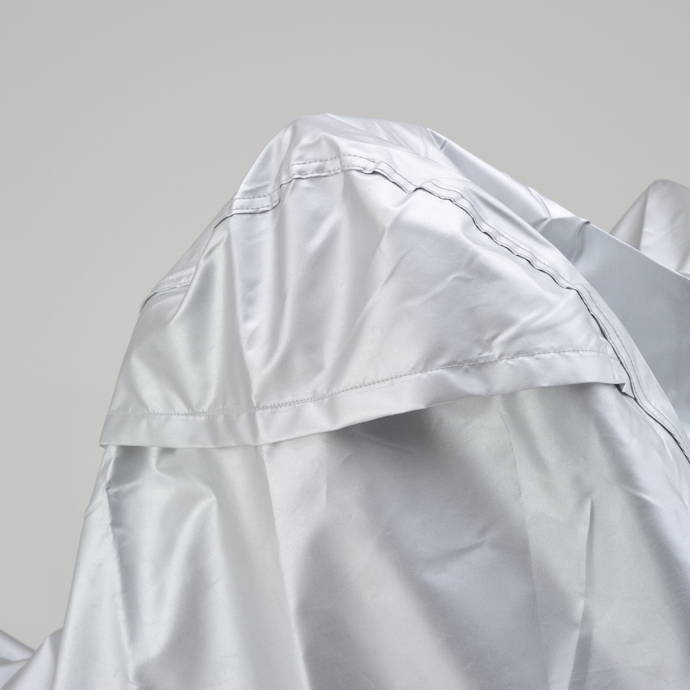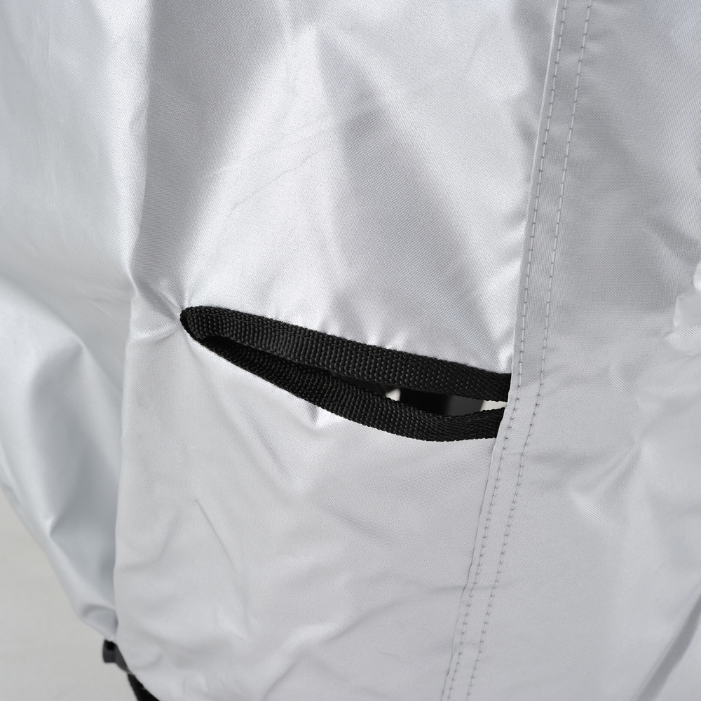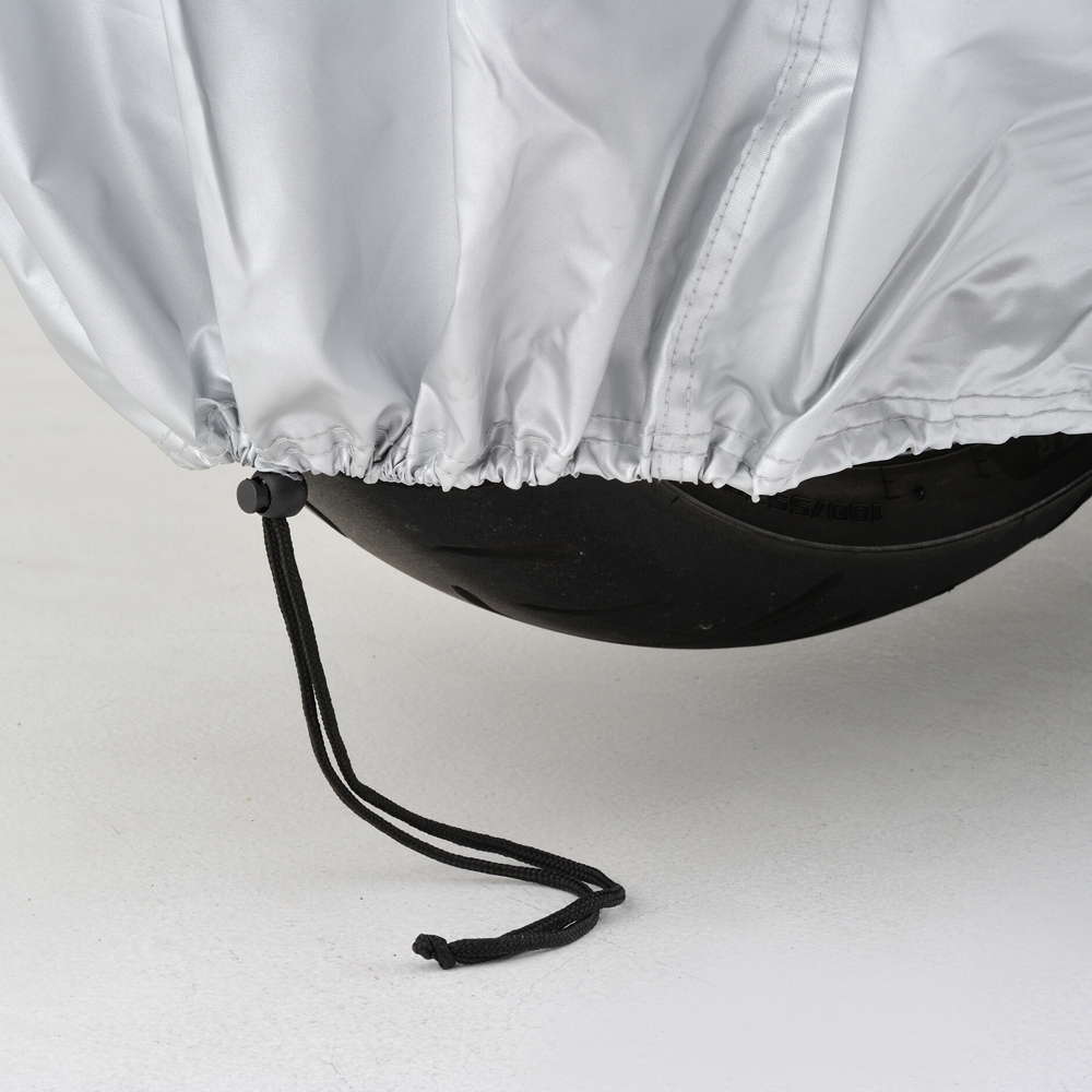 ・エアベント機構:左右ミラー部のエアベント機構が、湿気を排出します。・前後判別:チェーンホールのフロント側を赤、リア側を黒に分けて前後の判別ができます。・後縛りひも:後部から裾を絞ることで、裾のめくれを防止します。・溶けない耐熱パッド:耐熱性コットンパッド付属。マフラーなど高温部に貼り付けることで、バイクカバーが溶けることを防ぎます。・風飛び防止センターベルト:車体横で固定できるので、地面に膝をついてベルトを装着する必要がありません。・大型ロック対応:前後に大型ロックに対応したチェーンホール(幅85mm)装備。カバーをめくってロックする必要がありません。カラー:シルバーサイズ:3L※生地表面にはっ水性のコーティングを施してありますが、完全防水ではありません。雨量・使用状況によっては浸み込む場合があります。また、特性上経年劣化によって防水性が著しく落ちます。あらかじめご了承ください。※耐熱パッドを貼り付けた部分でも、高速走行・高回転を多用するハードな走行直後は、マフラーが300℃以上の高温となり、表面まで熱が伝わる恐れがありますので、少し冷ましてからカバーを掛けてください。※車種適合表に記載されているサイズは、車両に対してタイトなサイズを表示しています。ゆったりカバーを被せたい場合は、1つ大きいサイズをおすすめします。【適合参考車種】X4、レブル250/500、Vツインマグナ 、XT1200Z Super TENERE、BOLT、TMAX500XV400、ドラッグスター250、マジェスティ、デスペラード400/800エリミネーター400、エリミネーター250、ZZR1100/ZZR1200/ZZR1400ZRX1100/1200/DAEG、ゼファー1100/1100RS、ゼファー750/750RSW650/W800BMW K1300R、BMW K1300S、BMW R1200R、BMW R1150RBMW F800ST、HD スポーツスター