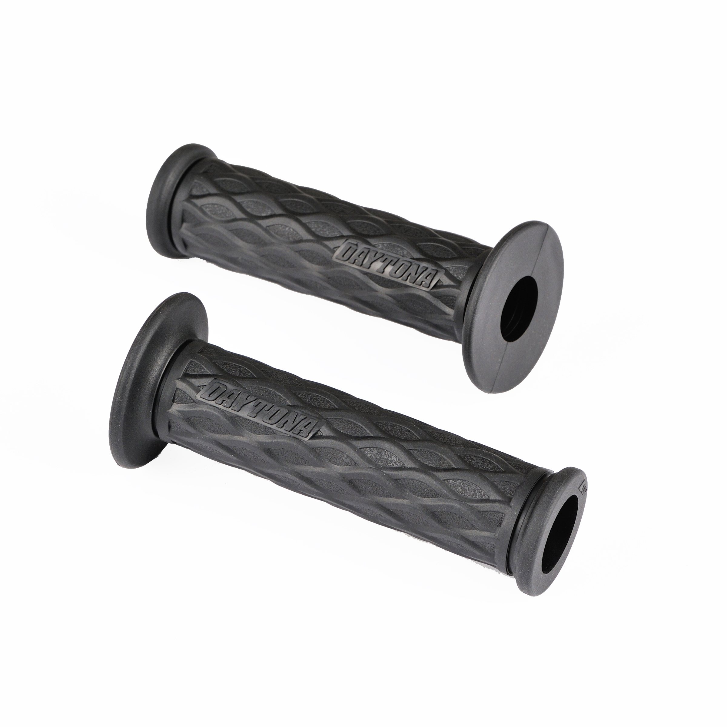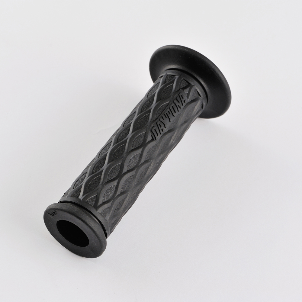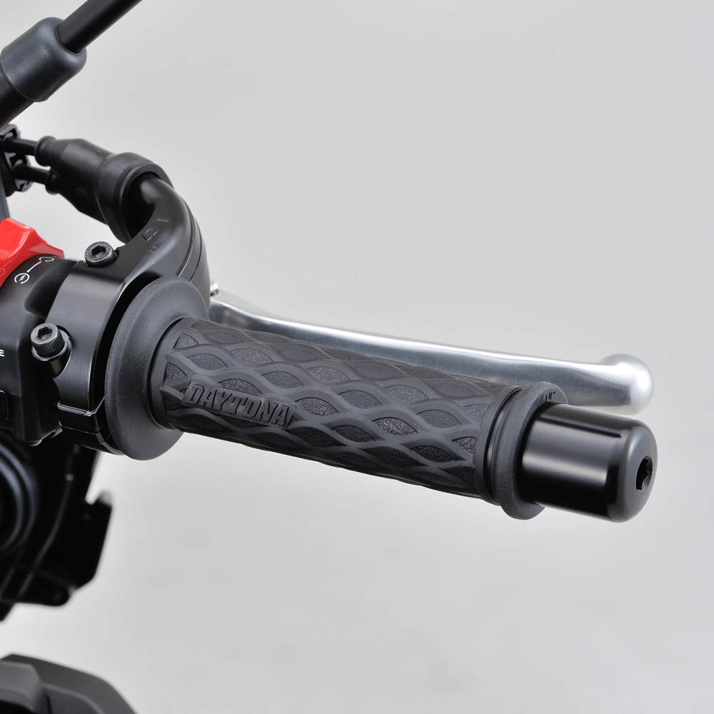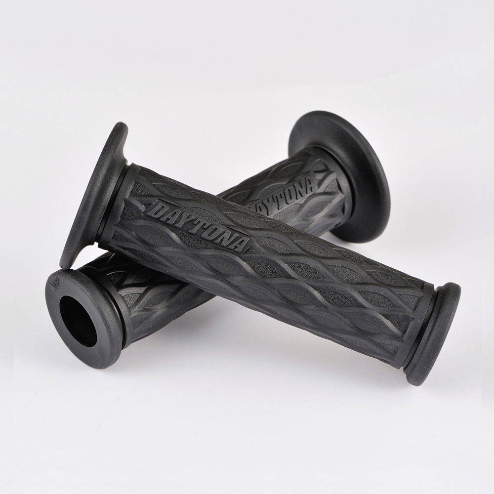 エルゴノミクス(人間工学)デザインを採り入れたデイトナオリジナルグリップ。アクセルを捻ったとき滑らない左右専用の表面パターンと、グリップ力に優れるやわらかな素材を外側、硬めの素材を内側に組み合わせた2層構造により、長時間のライディングでも疲れません。グリップデザインは美しい波のシックなイメージです。全長:125mmエンド貫通