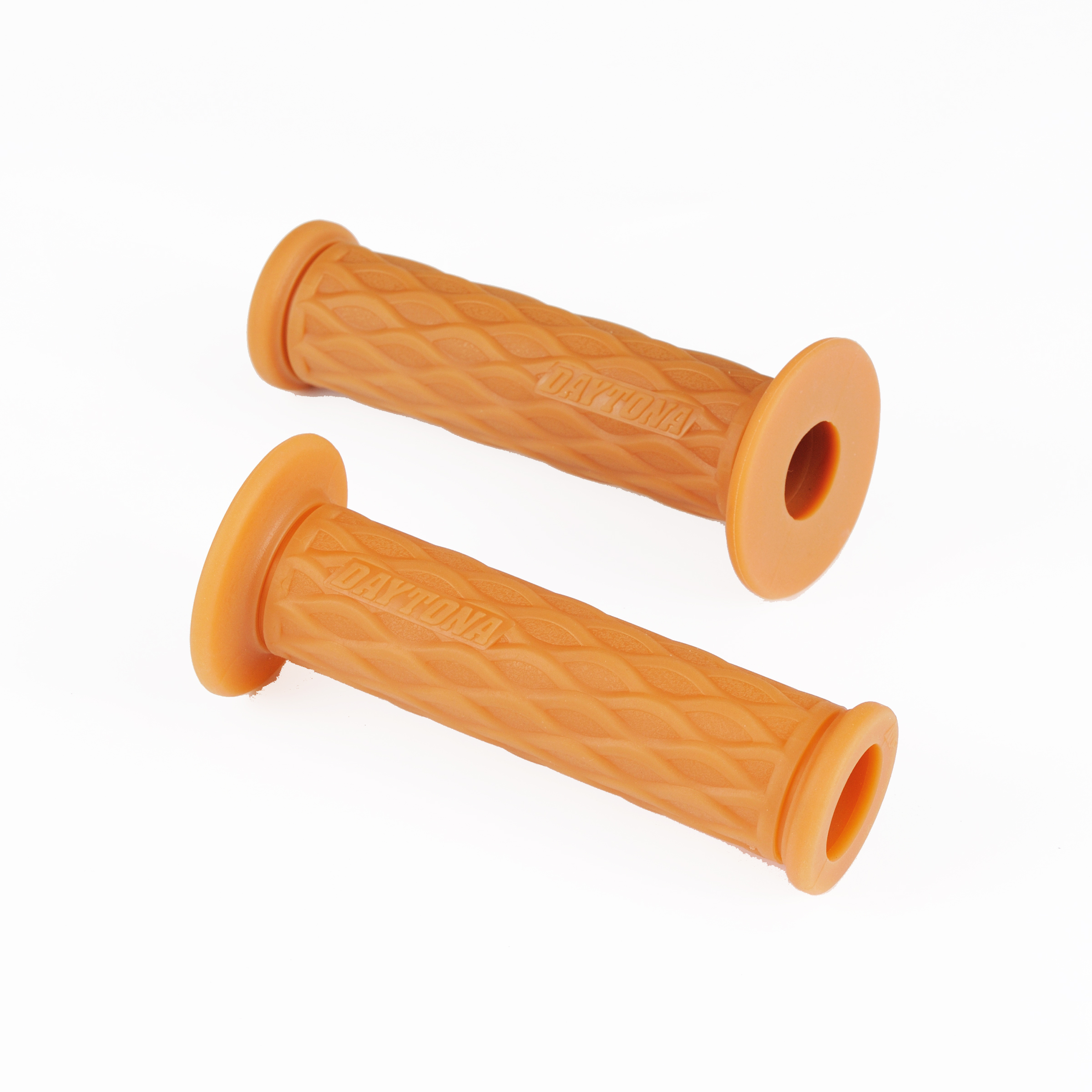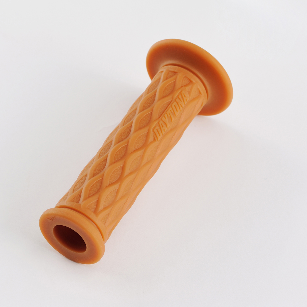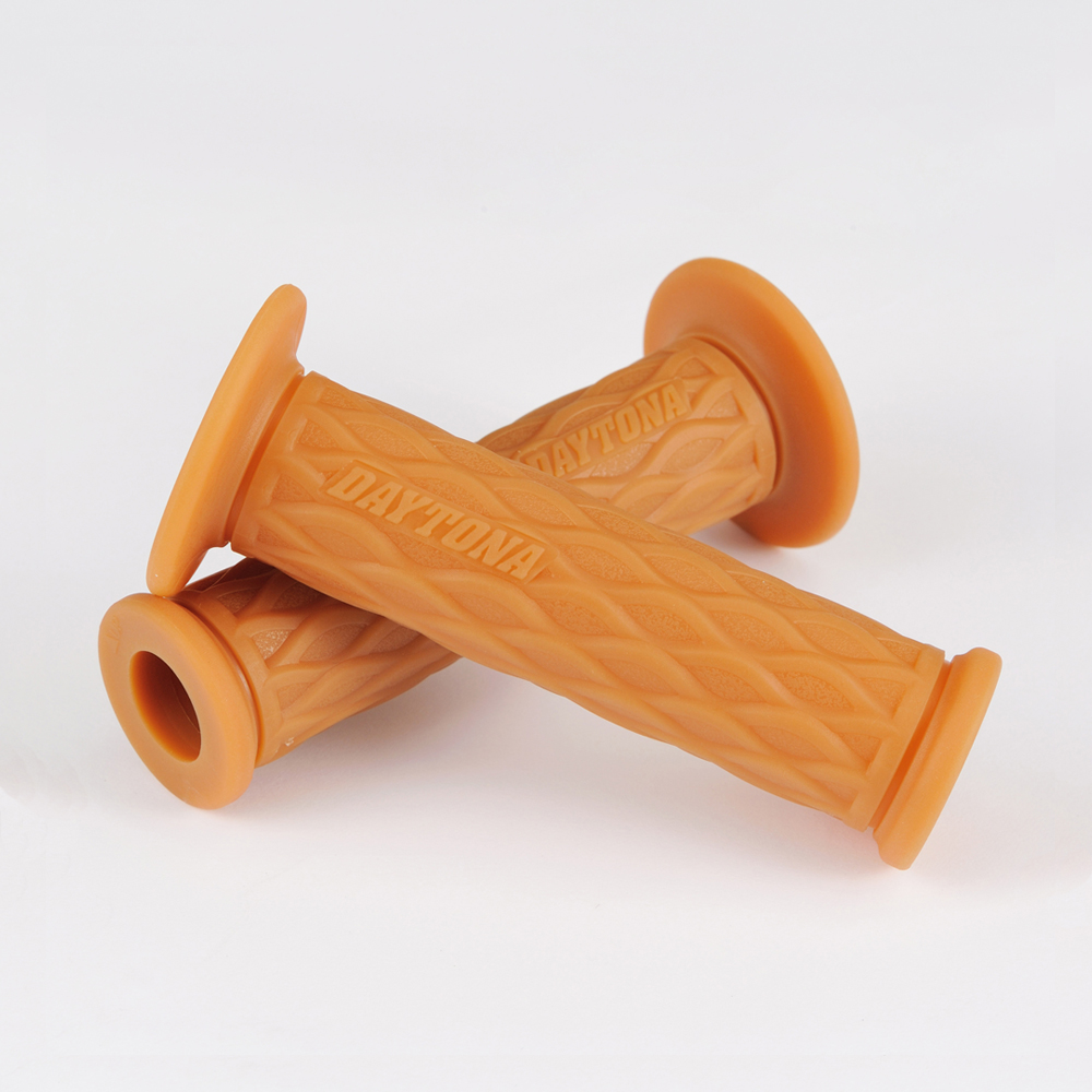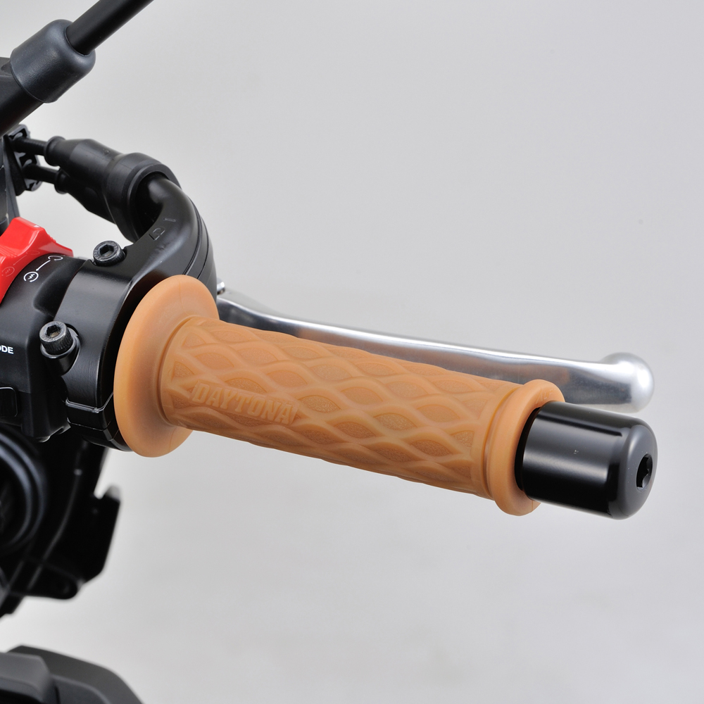 エルゴノミクス(人間工学)デザインを採り入れたデイトナオリジナルグリップ。アクセルを捻ったとき滑らない左右専用の表面パターンと、グリップ力に優れるやわらかな素材を外側、硬めの素材を内側に組み合わせた2層構造により、長時間のライディングでも疲れません。グリップデザインは美しい波のシックなイメージです。全長:125mmエンド貫通