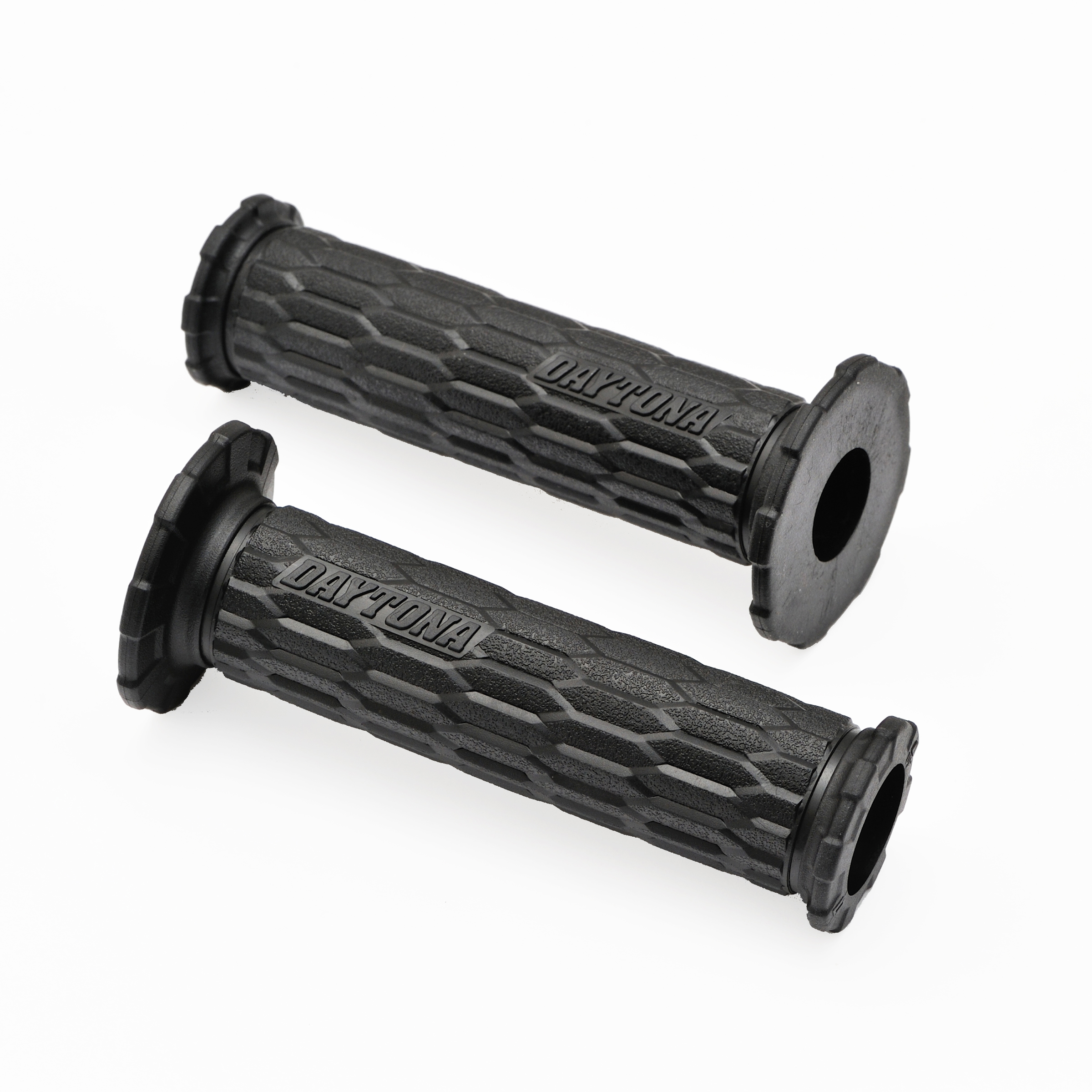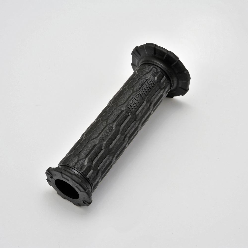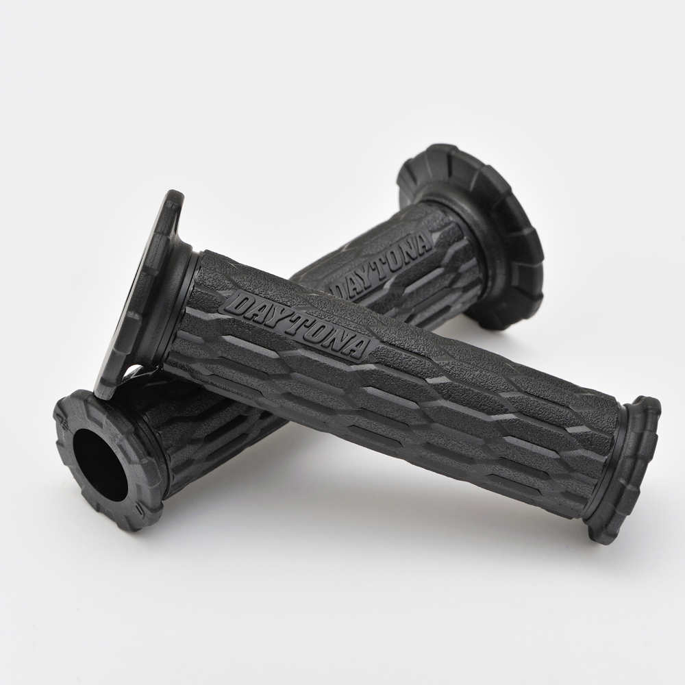 エルゴノミクス(人間工学)デザインを採り入れたデイトナオリジナルグリップ。アクセルを捻ったとき滑らない左右専用の表面パターンと、グリップ力に優れるやわらかな素材を外側、硬めの素材を内側に組み合わせた2層構造により、長時間のライディングでも疲れません。グリップデザインはヘキサゴン形状のシャープなイメージです。全長:125mmエンド貫通