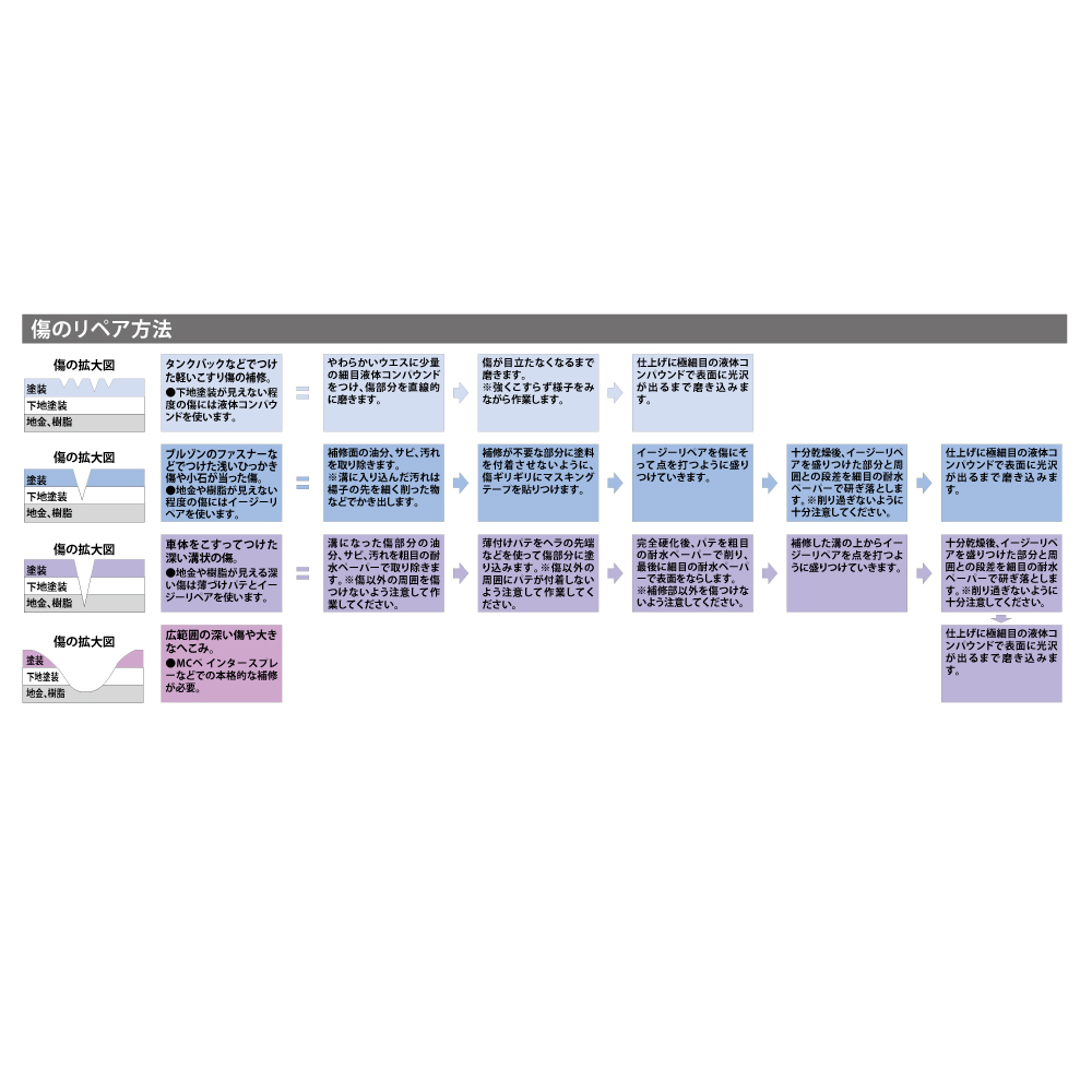 フェルトタイプのペンで、着色箇所へ押し付けながら「色を乗せて」ゆく、補修用簡易塗料です。※純正塗装とは作業工程が異なるため、同一の色合いを再現することはできません。※へこみや深いこすり傷には、別途パテ盛り等の作業が必要となります。参考適合車種:CRF1000L Africa Twin(CRF カラー)、VFR800F、CBR1000RR SPCBR1000RR SP2、CBR400R、X-ADVCBR650F/CB650F、レブル500、CBR250RR、FAZE