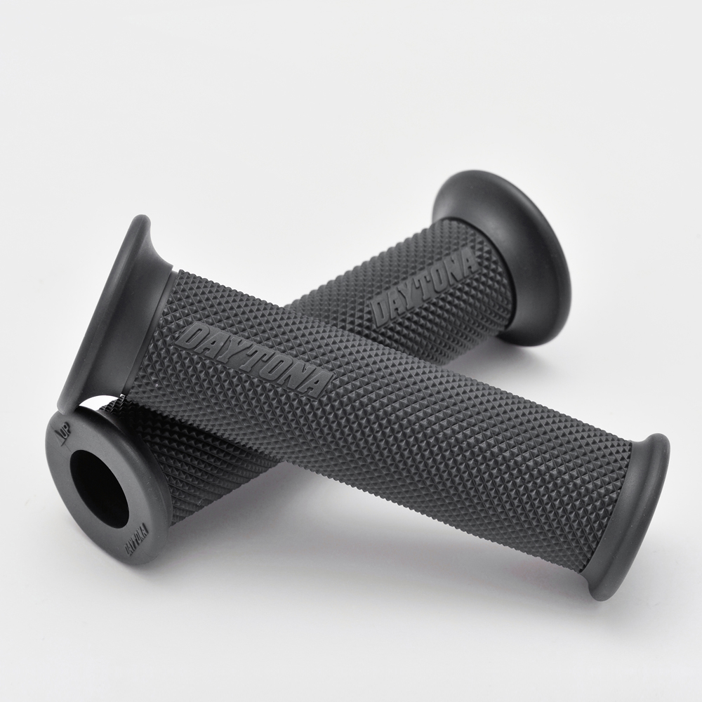 エルゴノミクス(人間工学)デザインを採り入れたデイトナオリジナルグリップ。アクセルを捻ったとき滑らない左右専用の表面パターンと、グリップ力に優れるやわらかな素材を外側、硬めの素材を内側に組み合わせた2層構造により、長時間のライディングでも疲れません。D-BASEはシンプルなピラミッド構造で、昔ながらの人気のデザイン。一般的な突起のサイズを大きく、よりエッジを効かせたました。全長:125mmエンド貫通※確実に取り付けるため、グリップボンドを使用してください。セーフティワイヤーを併用すると、より効果的です。※純正スロットルスリーブがリブ付構造の車両はリブを削ってください。