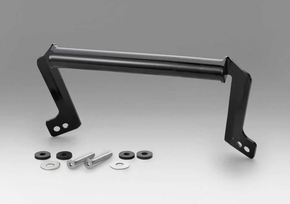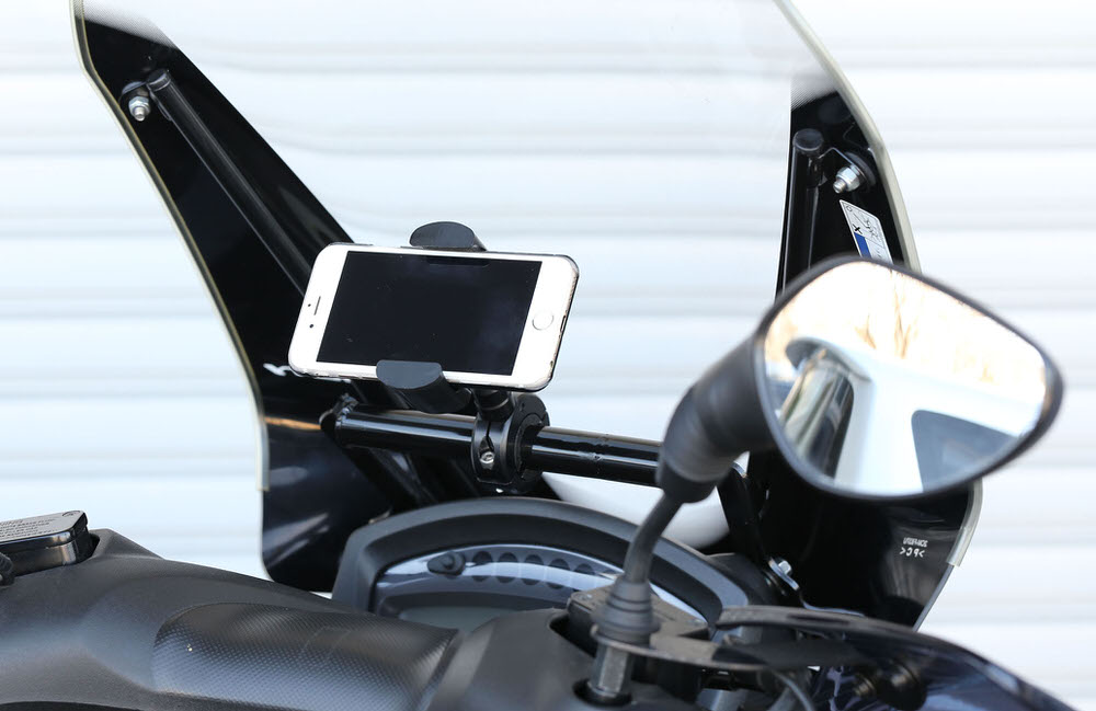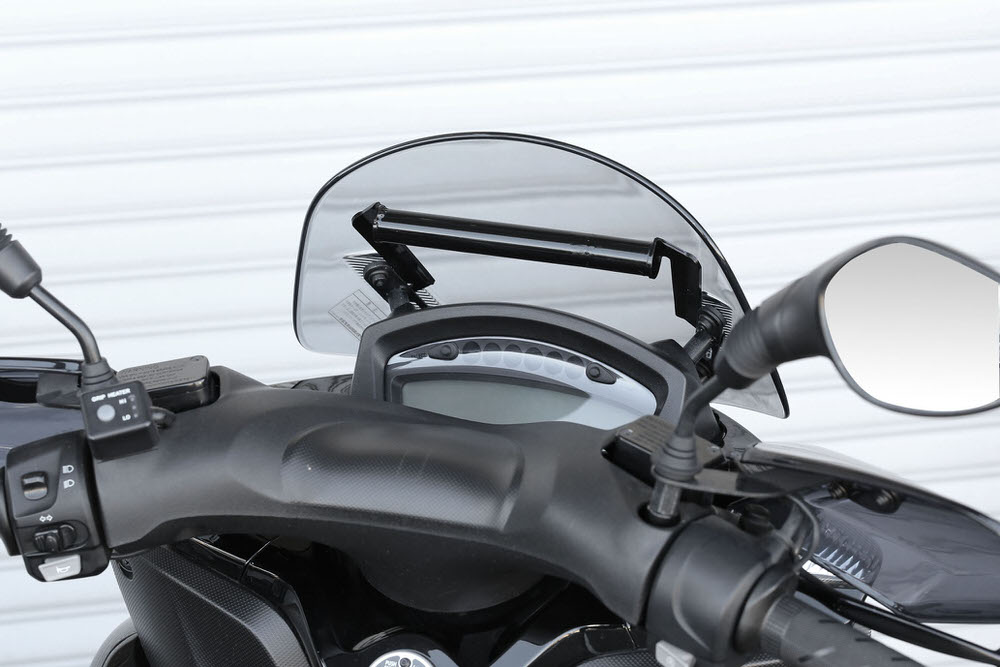 視点を変えずにデバイスやスマホでナビなど画面を確認出来る位置にマウントステーを設置。純正スクリーンはもちろん、純正オプションのロングスクリーンでも問題なく使用出来る作り。クランプ部:22.2mm 有効長:184mmスチール製 ブラック仕上げ