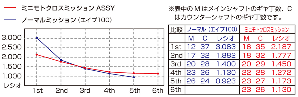 ノーマルの5速から6速に細分化し、スムーズなつながりを実現させたミッションASSY。パワーバンドを維持したスポーツ走行に有効です。各ギアのさらなるクロスレシオ化や強度の向上、軽量化によるフリクションロスの低減等、よりレースでの使用に特化させたトランスミッションです。【 ギヤレシオ 】ノーマルミッション(エイプ100)1st:3,083 12/372nd:1,882 17/323rd:1,400 20/284th:1,130 23/265th:0,923 26/24ミニモトクロスミッション ASSY1st:2,187 16/352nd:1,777 18/323rd:1,450 20/294th:1,272 22/285th:1,173 23/276th:1,130 23/26
