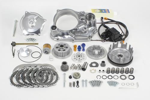 アルミダイカスト製右クランクケースカバーにアルミ鍛造クラッチカバーを採用。スペシャルクラッチキット(WET) ※スリッパークラッチ機構はありません。油圧式ノーマルメインシャフト用ノーマルメインシャフト用は車両からエンジンを降ろす必要が無く、ノーマルミッションのままでスペシャルクラッチを装着することが出来ます。このキットの取付け構造は特許を取得しております。スペシャルクラッチキット(WET)※スリッパークラッチ機構はありません。油圧式右クランクケースカバー、クラッチカバー詳細アルミダイカスト製右クランクケースカバー:バフ研磨クリア塗装仕上げ■兼用の右クランクケースカバーを採用湿式クラッチと乾式クラッチのどちらにも使用出来る右クランクケースカバー形状を採用。湿式クラッチ購入後も乾式クラッチへの仕様変更が可能です。■アルミ削り出しクラッチカバー(油圧式)クラッチカバーはアルミ材を精巧に削り出し、表面にシルバーアルマイトを施しております。又、クラッチカバー中央には“HYDRAULIC”ロゴが入っております。レリーズピストン径Φ33を採用。■大型オイルフィラーキャップを採用アルミダイカスト製クロムメッキ仕上げ■オイルエレメントろ過能力に優れたカートリッジ式ペーパータイプを採用。■オイルレベル確認窓付き別売りオプションパーツについてオイルクーラーユニットをオイルエレメント部に装着することで、オイルクーラーへのオイル取出しが行えます。SP武川ではオイルクーラーユニット付きのオイルクーラーキットがあります。SP武川WEBカタログをご覧下さい。オイルラインにSP武川製インラインサーモユニットを装着することで、オーバークールの防止が可能になります。スペシャルクラッチインナーキット TYPE-R(WET/標準仕様)■クラッチユニットの変更ノーマルクランクシャフト(1次側)からミッションのメインシャフト(2次側)に変更することで、クランクシャフトの負担を軽減すると共にクランクシャフト軸の軽量化が可能になり、軽やかなスロットルレスポンスを発揮します。■6ディスク仕様従来品に比べ、クラッチアウターなどの回転部分を小径化することで、オイル拡散によるロス馬力の減少や更なるレスポンスの向上と回転マス重量の約12%軽減を実現し、エンジンパワーを無駄無く伝達します。ケブラー配合フリクションディスクを6枚採用し、6ディスク化を実現。これにより、クラッチの容量が従来品に比べ約20%アップし、ハイパワーエンジンに対応します。■クラッチは標準仕様(スリッパークラッチ機構無し)になります。■クラッチアウタークラッチ接続時、ギア等のショック軽減を図り、ラバーダンパーを内蔵。■アルミダイカスト製リフタープレート■クラッチスプリング:耐疲労性に優れ、安定したクラッチフィールを実現。注意事項SP武川製オイルクーラーを使用し、クラッチカバーにオイルホースを接続している場合はバンジョー、ホース長の変更が必要になります。ノーマルマフラー、アップマフラーの同時装着は出来ません。12V DAX50は、付属のクラッチマスターシリンダーを取付ける場合、ノーマルクラッチレバー&ホルダーを取外す必要がある為、SP武川製モンキー用コンビネーションスイッチ(05-09-0028)の別途購入が必要になります。(配線加工有)ノーマルメインシャフト用(ノーマルミッション用)です。