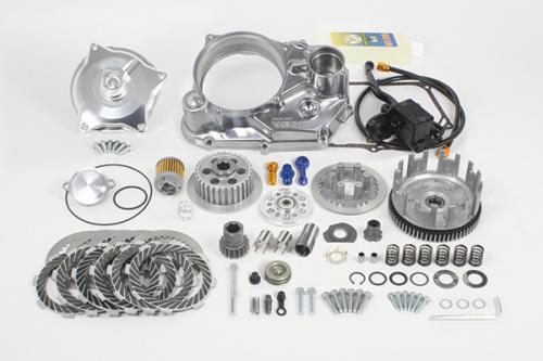 アルミダイカスト製右クランクケースカバーにアルミ鍛造クラッチカバーを採用。スペシャルクラッチキット(WET) ※スリッパークラッチ機構はありません。油圧式ノーマルメインシャフト用ノーマルメインシャフト用は車両からエンジンを降ろす必要が無く、ノーマルミッションのままでスペシャルクラッチを装着することが出来ます。このキットの取付け構造は特許を取得しております。スペシャルクラッチキット(WET)※スリッパークラッチ機構はありません。油圧式右クランクケースカバー、クラッチカバー詳細アルミダイカスト製右クランクケースカバー:バフ研磨クリア塗装仕上げ■兼用の右クランクケースカバーを採用湿式クラッチと乾式クラッチのどちらにも使用出来る右クランクケースカバー形状を採用。湿式クラッチ購入後も乾式クラッチへの仕様変更が可能です。■アルミ削り出しクラッチカバー(油圧式)クラッチカバーはアルミ材を精巧に削り出し、表面にシルバーアルマイトを施しております。又、クラッチカバー中央には“HYDRAULIC”ロゴが入っております。レリーズピストン径Φ33を採用。■大型オイルフィラーキャップを採用アルミダイカスト製クロムメッキ仕上げ■オイルエレメントろ過能力に優れたカートリッジ式ペーパータイプを採用。■オイルレベル確認窓付き別売りオプションパーツについてオイルクーラーユニットをオイルエレメント部に装着することで、オイルクーラーへのオイル取出しが行えます。SP武川ではオイルクーラーユニット付きのオイルクーラーキットがあります。SP武川WEBカタログをご覧下さい。オイルラインにSP武川製インラインサーモユニットを装着することで、オーバークールの防止が可能になります。スペシャルクラッチインナーキット TYPE-R(WET/標準仕様)■クラッチユニットの変更ノーマルクランクシャフト(1次側)からミッションのメインシャフト(2次側)に変更することで、クランクシャフトの負担を軽減すると共にクランクシャフト軸の軽量化が可能になり、軽やかなスロットルレスポンスを発揮します。■6ディスク仕様従来品に比べ、クラッチアウターなどの回転部分を小径化することで、オイル拡散によるロス馬力の減少や更なるレスポンスの向上と回転マス重量の約12%軽減を実現し、エンジンパワーを無駄無く伝達します。ケブラー配合フリクションディスクを6枚採用し、6ディスク化を実現。これにより、クラッチの容量が従来品に比べ約20%アップし、ハイパワーエンジンに対応します。■クラッチは標準仕様(スリッパークラッチ機構無し)になります。■クラッチアウタークラッチ接続時、ギア等のショック軽減を図り、ラバーダンパーを内蔵。■アルミダイカスト製リフタープレート■クラッチスプリング:耐疲労性に優れ、安定したクラッチフィールを実現。