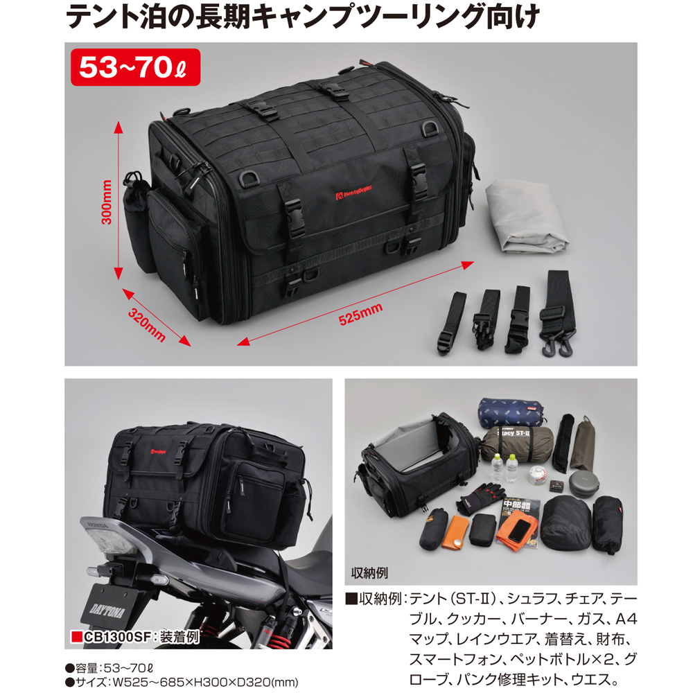 旅先での荷物の増減に対応する容量可変式補強フレーム&プレートが荷崩れを防止します。容量可変:可変ファスナーで素早く容量アップ。旅先で荷物が増えても安心。レインカバー:底面の紛失防止ベルトと4か所のコード調節付き。容量可変にもしっかり対応。大きな開口部:出し入れをしやすくするために、開口部を広く設計。パルステープ:デザイン性と拡張性を持ち合わせた機能。一定の間隔で縫い付けたテープにカラビナなどが装着可能。ドリンクホルダー&サイドポケット:左右にドリンクホルダーとポケットを装備。使用頻度の高い物やレインカバーなどの収納に便利。盗難防止:別売りのダイヤルロック(品番:75923)が使用可能。ショルダーベルト:車体から外した際の持ち歩きに便利。上部Dリング:上部のDリングを使ってネットの固定が可能。荷物が増えても安心の設計。リフレクター:バッグに馴染むダークグレーのリフレクターを後方に装備。夜間の視認性を高めます。共通固定バックル:DH-717/718/719/724のバックルを統一。同シリーズであれば面倒なベルト交換無しで装着可能。補強フレーム:側面縁の金属ワイヤーはバッグをしっかりと形状維持。前後、底面にも補強板が入り荷崩れを防止。連結バックル:別売のシートバッグ(品番:96047 3WAYシートバッグ)と連結可能。両サイドオープンファスナー:バッグ上部に荷物があっても、両サイドから荷物の出し入れが可能。コンパクトに保管可能:側面を内側へ折り畳んでコンパクトに保管が可能。可変時の垂れ下がり防止機能:補強板を装備させることで、可変時でもバッグのバランスが崩れない。ホールドベルト:銀ロールマットなどの長物を固定できるベルトを付属。容量:53〜70リットルサイズ:W525〜685×H300×D320(mm)