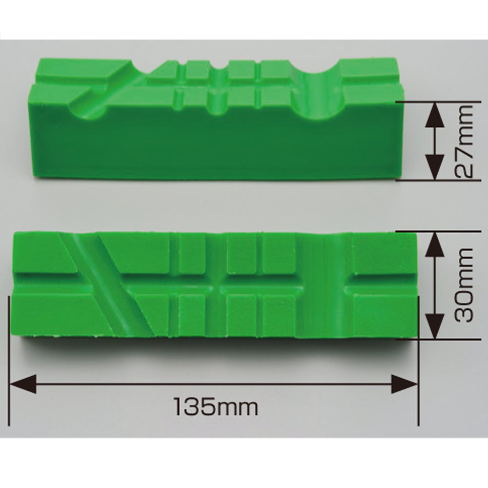 デイトナ製ミニベンチバイス(97222)での作業時にクランプ部に本品を装着することで、固定物が傷付きにくくなるポリウレタン製のパッド。背面のマグネットによりクランプへしっかり装着できるので、作業中に位置がずれにくく、しっかりと固定物を挟むことが可能です。パイプなどを挟む際に便利な固定用の溝付き。※ベンチバイス開き幅より、本品厚み分有効寸法を減算する必要があります。