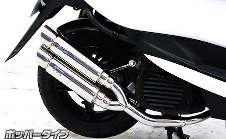 2本出しタイプマフラーは発売以来大好評で、いまだ人気が衰えず絶好調です。アトミックツインマフラーは、ビックスクーター界で主流になりはじめたサイレンサーを短くした、最先端のドレンドマフラーです。極端に派手すぎずできるだけシンプルに自然なラインをイメージして制作しました。サイレンサーをできるだけ短くとり、車体のラインに調和させました。たくさんのお客様からの意見を取り入れて、あらゆるカスタムに似合うよう高級感が高く、かつシンプルなイメージでデザイン、製作いたしました。他社には無い時代を先行く2本出しマフラーが完成しました。サイレンサー出口は ポッパータイプです。バッフル(消音用パーツ)は、サイレンサー1本に対し1つずつ装備されていますので、簡単な作業で3種類の音量を選択できます。音質はとてもマイルドで重低音です。車体への固定方法は、画像では分かりにくいですがノーマルマフラーと同じ2点止めです。材質は、耐久性、耐腐食性の高いSUS304ステンレス製です。 バッフル(消音用のパーツ)をサイレンサー1本に対し1つずつ標準装備。簡単な作業で3種類の音量が選択可能。バッフル両方装着時-排気音量 約 84db(法定音量規制内)バッフル片側装着時-排気音量 約 86dbバッフル非装着時-排気音量 約 88db