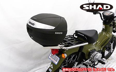 SHAD(シャッド)社製リアボックス【 SH29 】(サイズ:380mm (L) x 400mm (W) x 300mm (H)・本体重量:約2.6kg・容量:29Lを装備したタンデムバーです。リアボックスは車種よっては加工や専用ステーを別途購入しないと取り付けできませんが、ダブルリアキャリアにリアボックス用ベースブラケットを融合する事によって無加工で装着できるようにしました。リアボックスのスペックはディフューザーダクトなどの付加物のある大きめのフルフェイスのヘルメットが1個と、グローブなど+αが収納できるサイズで最大積載量は3kgです。材質は無塗装ブラックの材質PP(ポリプロピレン)で、丈夫な作りになっています。開閉はレバーを押すだけで簡単にできます。付属のキーでロックも可能。リアボックスの取り外しはレバーを押すだけで簡単に脱着でき、持ち運びが簡単にできるのでいたずらや盗難から大切な荷物を守る事ができます。ダブルリアキャリアの材質は、耐久性、耐腐食性の高いSUS304ステンレス製です。仕上げはバフ掛けを施していますので、高級感タップリでドレスアップにも最適の逸品です。リアボックス用ベースブラケットには、GIVI(ジビ)社 製、COOCASE(クーケース)社 製リアボックスのベースを取り付ける専用穴も開いていますので、それぞれのリアボックスもボルトオンで取り付け可能です。(ボックスによっては穴あけなどの加工が必要になります。)その他汎用リアボックスも取り付け穴を利用して取り付けできます。(ボックスによっては穴あけなどの加工が必要になります。)取り付けするリアボックスの容量はおよそ28Lまでのボックスをお取り付けください※画像と同じタイプの荷台を装備している車体のみに取付可能です。荷台の形状が違う車体には取り付けできませんのでご注意下さい。※画像の車両はクロスカブ110(JA45)です。実際の商品はJA44用となります。