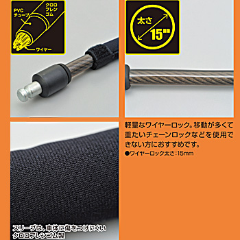 携帯するのに便利な軽量ワイヤーロック。スリーブは、車体に傷をつけにくいクロロプレンゴム製。ロック部寸法34×35×80(mm)重量:670gワイヤーロック径:φ15mm