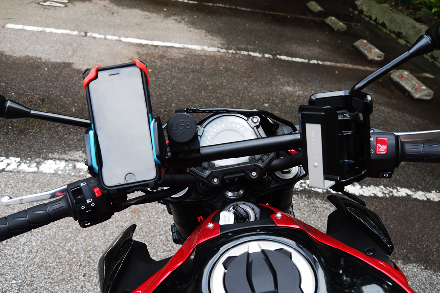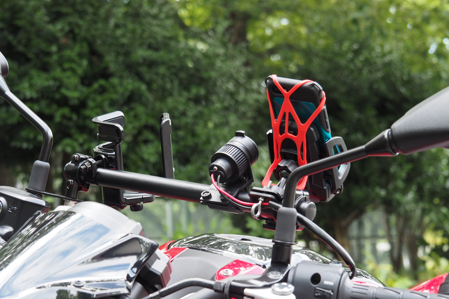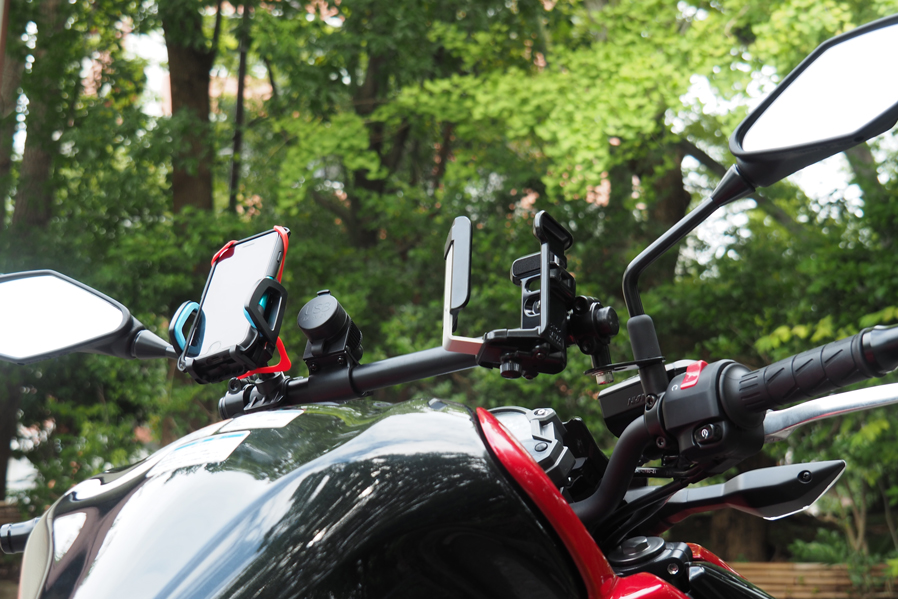 バー本体:スチールカチオン塗装仕上げクランプ:アルミウレタン塗装仕上げキャップ:ABSボルト類:スチール・ステンレスパイプ長350mm ガジェットマウント範囲 310mm【スマホやUSBチャージャー、ナビなど複数のガジェットをマウントするバーを作りました】ワールドウォークは視認性の良い場所にスマートフォンをマウントする為のバーをリリースしています。大変ご好評頂いていますが、イベントなどでお客様のバイクを拝見すると複数のガジェット(便利な小物)をハンドル周りにマウントしているのを見かけることが増えてきました。しかし近年テーパーハンドルを採用している車両も増えてきておりハンドル径が一定ではないのでガジェットの装着が難しく、スクーターなどはクランプするハンドルが露出していない車種が多いのでハンドルマウントのガジェットが装着できません。。またハンドルの形状も真っ直ぐではないので取り付けに苦労する事もあります。そこでワールドウォークが開発したのが複数のガジェットをマウントする事を目的に開発したバー。マルチガジェットマウントバーです。【複数がジェットをマウントするのに最適な剛性、設計を取り入れています】スマートフォンやドリンクホルダー、USBチャージャーやナビゲーションシステムなどハンドル周りにマウントして使うガジェットは増えており、快適にバイクに乗るために複数のガジェットをマウントして使用しているユーザーが増加傾向にあるのは前述したとおりです。マルチガジェットマウントバーは車種によって取り付け方法が若干異なりますが複数のガジェットをマウントしても問題ない強度を確保しバー本体は国産ハンドルと同じ22.2φを採用。バイク用のガジェットであれば殆どの製品をマウントする事が可能です。車体との干渉などを避けるために車種によってバーの長さは異なりますが3〜5個程度のガジェットをマウントする事を想定しています。【メーターの視認性には充分配慮して設計しています】メーターにはスピードやガソリン残量、オドメーターなど大事なインフォメーションが表示されます。そのためガジェットを装着した際にメーターの視認性が悪くなってしまうのは避けたいところです。ガジェットを装着する位置は工夫しなければなりませんが、可能な限りメーターの視認性が悪くならない位置にバーがくるように調整しました。【ハンドルをフルにきってもガジェットがあたりにくい設計です】ハンドルをフルできった時にスイッチボックスとガソリンタンクのクリアランスが狭いバイクは多々あります。そのためハンドルバーに直接ガジェットをマウントすると干渉してしまうリスクがあります。マルチガジェットバーはハンドルバーよりガジェットをマウントするバーが高い位置になるようしているので干渉しずらい設計です。【バー部分はスチール材を採用しカチオン塗装仕上げです】ガジェットの脱着を繰り返す事を前提に設計したのでバー本体部分は硬く摺れに強いスチールを採用しカチオン塗装で仕上げています。密着性に優れた厚い塗膜を形成することができるため、防錆、防食効果の高い塗装です。【クランプ部分はアルミの塗装仕上げです】バーをクランプする部分は軽量で腐食に強いアルミを採用し塗装で仕上げています。バーエンド部分にはプラスチック製のキャップを採用。雨天時に水などが入るのを防ぎます。全ての素材を同じにするのではなく、場所によって最適な素材を選択しています。