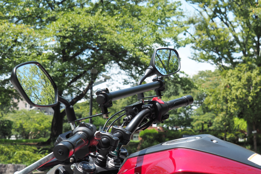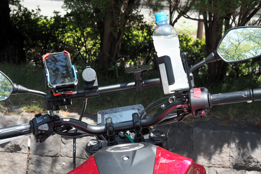 バー本体:スチールカチオン塗装仕上げクランプ:アルミウレタン塗装仕上げキャップ:ABSボルト類:スチール・ステンレスパイプ長400mm ガジェットマウント範囲 360mm【スマホやUSBチャージャー、ナビなど複数のガジェットをマウントするバーを作りました】ワールドウォークは視認性の良い場所にスマートフォンをマウントする為のバーをリリースしています。大変ご好評頂いていますが、イベントなどでお客様のバイクを拝見すると複数のガジェット(便利な小物)をハンドル周りにマウントしているのを見かけることが増えてきました。しかし近年テーパーハンドルを採用している車両も増えてきておりハンドル径が一定ではないのでガジェットの装着が難しく、スクーターなどはクランプするハンドルが露出していない車種が多いのでハンドルマウントのガジェットが装着できません。。またハンドルの形状も真っ直ぐではないので取り付けに苦労する事もあります。そこでワールドウォークが開発したのが複数のガジェットをマウントする事を目的に開発したバー。マルチガジェットマウントバーです。【複数がジェットをマウントするのに最適な剛性、設計を取り入れています】スマートフォンやドリンクホルダー、USBチャージャーやナビゲーションシステムなどハンドル周りにマウントして使うガジェットは増えており、快適にバイクに乗るために複数のガジェットをマウントして使用しているユーザーが増加傾向にあるのは前述したとおりです。マルチガジェットマウントバーは車種によって取り付け方法が若干異なりますが複数のガジェットをマウントしても問題ない強度を確保しバー本体は国産ハンドルと同じ22.2φを採用。バイク用のガジェットであれば殆どの製品をマウントする事が可能です。車体との干渉などを避けるために車種によってバーの長さは異なりますが3〜5個程度のガジェットをマウントする事を想定しています。【メーターの視認性には充分配慮して設計しています】メーターにはスピードやガソリン残量、オドメーターなど大事なインフォメーションが表示されます。そのためガジェットを装着した際にメーターの視認性が悪くなってしまうのは避けたいところです。ガジェットを装着する位置は工夫しなければなりませんが、可能な限りメーターの視認性が悪くならない位置にバーがくるように調整しました。【ハンドルをフルにきってもガジェットがあたりにくい設計です】ハンドルをフルできった時にスイッチボックスとガソリンタンクのクリアランスが狭いバイクは多々あります。そのためハンドルバーに直接ガジェットをマウントすると干渉してしまうリスクがあります。マルチガジェットバーはハンドルバーよりガジェットをマウントするバーが高い位置になるようしているので干渉しずらい設計です。【バー部分はスチール材を採用しカチオン塗装仕上げです】ガジェットの脱着を繰り返す事を前提に設計したのでバー本体部分は硬く摺れに強いスチールを採用しカチオン塗装で仕上げています。密着性に優れた厚い塗膜を形成することができるため、防錆、防食効果の高い塗装です。【クランプ部分はアルミの塗装仕上げです】バーをクランプする部分は軽量で腐食に強いアルミを採用し塗装で仕上げています。バーエンド部分にはプラスチック製のキャップを採用。雨天時に水などが入るのを防ぎます。全ての素材を同じにするのではなく、場所によって最適な素材を選択しています。