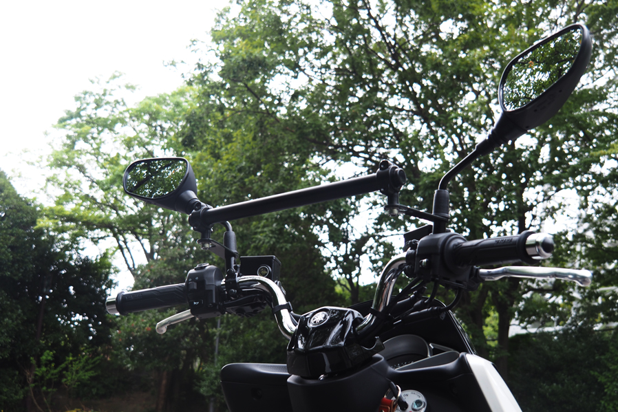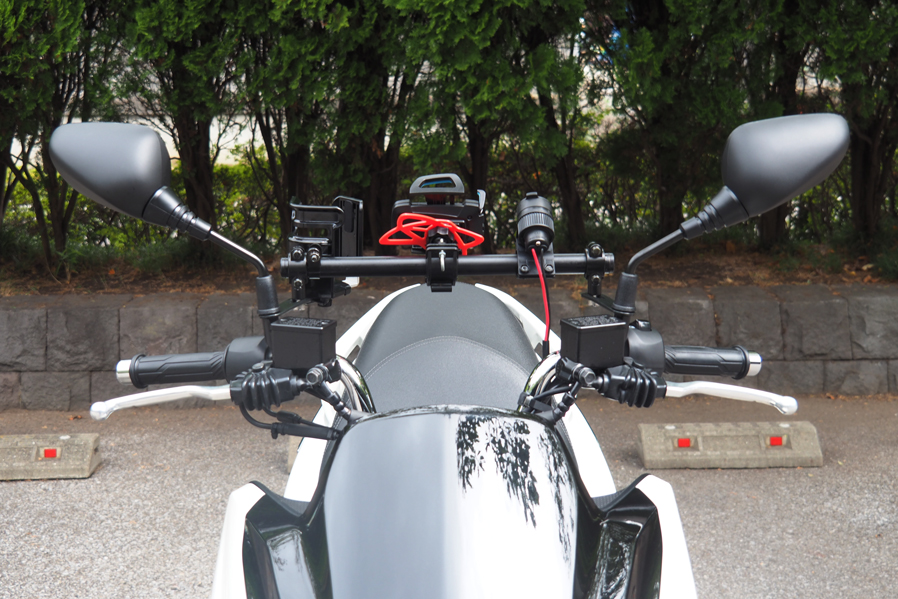 メーターにはスピードやガソリン残量、オドメーターなど大事なインフォメーションが表示されます。そのためガジェットを装着した際にメーターの視認性が悪くなってしまうのは避けたいところです。ガジェットを装着する位置は工夫しなければなりませんが、可能な限りメーターの視認性が悪くならない位置にバーがくるように調整しました。
