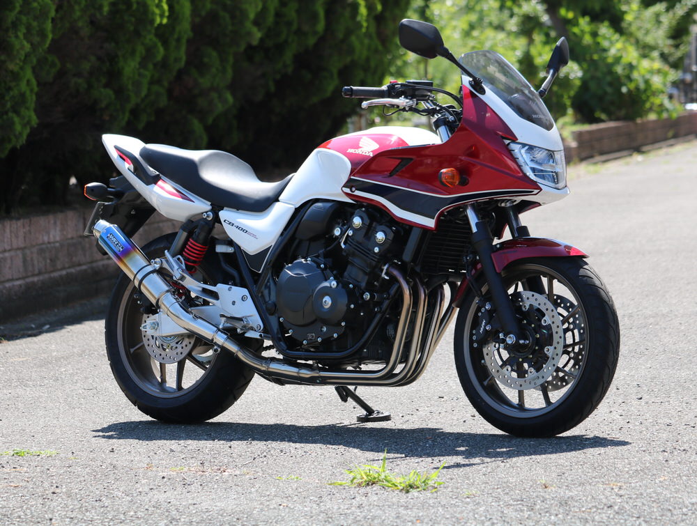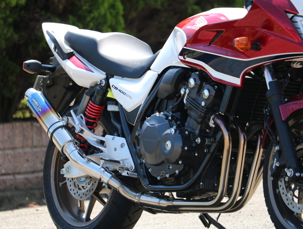 ベンチテストにより徹底的に性能をチェック、CB400SF・SBの特性をより活かすべく開発しました。アクセルレスポンスの改善、低中速域〜高速域に至るまで全域においてアップデートを実現しました。センターパイプには大口径φ60.5センターパイプを採用。排ガス浄化性能を高めつつ最適なパワーフィールを実現。今回、CB400SF・SB用にショートタイプの『Sラウンド』サイレンサー(φ86×330mm)を採用。アグレッシブなスタイルを演出し、CB400SF・SBのスタイルをよりスポーティーに引き立ててくれます。Sラウンドサイレンサーの音質はワイルド&レーシーな音質を実現。重低音の効いた直4サウンドを堪能して下さい。※スリップオンマフラー取り付けに必要なジョイントガスケットを付属しております。近接/加速騒音値:94/78OF/Dボルト:OK政府認証:JMCA認証焼き色チタンサイレンサー仕様 マフラー重量:1.85kg(※サイレンサーバンド等の備品を含んだ重量。)