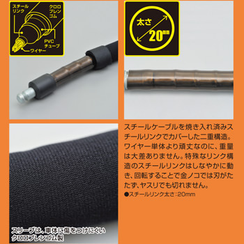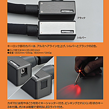 スチールケーブルを焼き入れ済みスチールリンクでカバーした二重構造。ワイヤー単体より頑丈なのに、重量は大差ありません。特殊なリンク構造のスチールリンクはしなやかに動き、回転することで金ノコでは刃がたたず、ヤスリでも切れません。スリーブは、車体に傷をつけにくいクロロプレンゴム製。カギ穴には雨やほこりを防ぐキーシャッター付き。ピッキングされにくい形状のキー3本付属。内1本は暗闇で便利なLEDライト付き。ロック部寸法34×35×80(mm)重量:1050gキーロック部カラー:シルバーワイヤーロック径:φ20mm