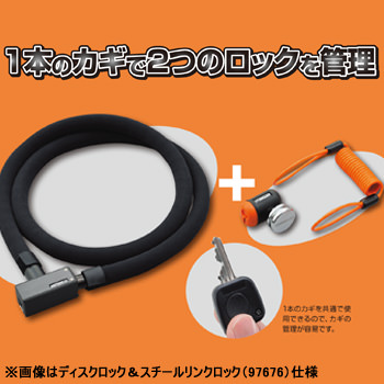 ディスクロックとスチールリンクロックのセット。2つのロックは同じカギで施錠できます。ディスクロックの外し忘れを防ぐスパイラルケーブル付き。自宅はダブルロックでガッチリ!出先ではディスクロックのみという使いかたもできて便利。単品で購入するよりお得です。スチールリンクロック ロック部分寸法:34×35×80(mm)重量:1050g(ディスクロックは含みません)ワイヤーロック径:φ20mm
