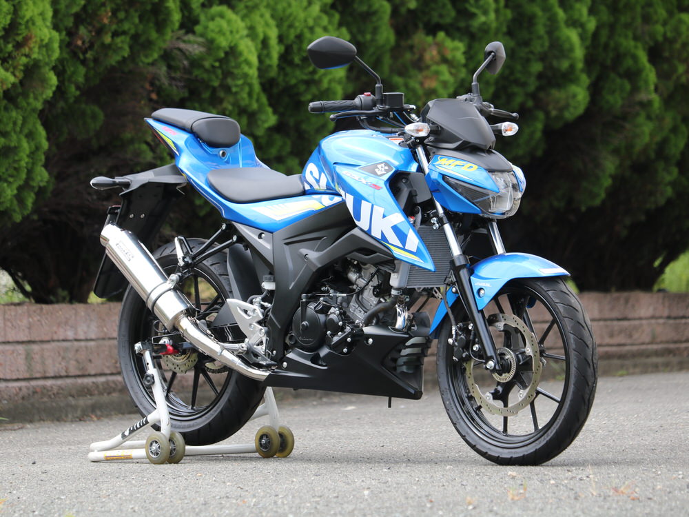 ステンレスサイレンサー仕様3.14kg(ノーマルマフラーは4.75kg)※サイレンサーバンド等の備品を含んだ重量。ノーマルに比べて圧倒的なパワーフィールを実現。GSX-S125ではピークパワー発生回転数が12,000rpmと、大幅にパワーバンドの拡大に成功。レーシングスピリッツそのままの性能をJMCA認証マフラーとして実現しました。音質はシングル独特のパルス感を更にレーシーなイメージに味付け、そのシングルサウンドを堪能頂けます。ノーマルマフラーの持つ重厚なイメージからよりスポーティーさを演出したラウンドタイプサイレンサー。近接騒音値/加速騒音値:88/77dbオイル交換:OKオイルフィルター:OKJMCA認証品オプション純正センタースタンド仕様可能。