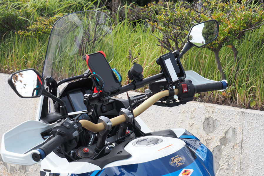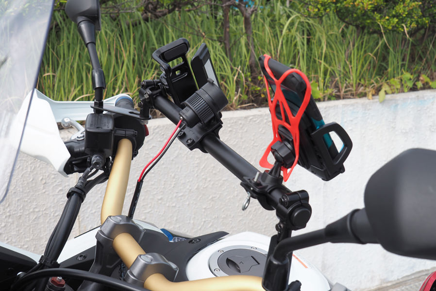 【スマホやUSBチャージャー、ナビなど複数のガジェットをマウントするバーを作りました】ワールドウォークは視認性の良い場所にスマートフォンをマウントする為のバーをリリースしています。大変ご好評頂いていますが、イベントなどでお客様のバイクを拝見すると複数のガジェット(便利な小物)をハンドル周りにマウントしているのを見かけることが増えてきました。しかし近年テーパーハンドルを採用している車両も増えてきておりハンドル径が一定ではないのでガジェットの装着が難しく、スクーターなどはクランプするハンドルが露出していない車種が多いのでハンドルマウントのガジェットが装着できません。。またハンドルの形状も真っ直ぐではないので取り付けに苦労する事もあります。そこでワールドウォークが開発したのが複数のガジェットをマウントする事を目的に開発したバー。マルチガジェットマウントバーです。【複数がジェットをマウントするのに最適な剛性、設計を取り入れています】スマートフォンやドリンクホルダー、USBチャージャーやナビゲーションシステムなどハンドル周りにマウントして使うガジェットは増えており、快適にバイクに乗るために複数のガジェットをマウントして使用しているユーザーが増加傾向にあるのは前述したとおりです。マルチガジェットマウントバーは車種によって取り付け方法が若干異なりますが複数のガジェットをマウントしても問題ない強度を確保しバー本体は国産ハンドルと同じ22.2φを採用。バイク用のガジェットであれば殆どの製品をマウントする事が可能です。車体との干渉などを避けるために車種によってバーの長さは異なりますが3〜5個程度のガジェットをマウントする事を想定しています。【メーターの視認性には充分配慮して設計しています】メーターにはスピードやガソリン残量、オドメーターなど大事なインフォメーションが表示されます。そのためガジェットを装着した際にメーターの視認性が悪くなってしまうのは避けたいところです。ガジェットを装着する位置は工夫しなければなりませんが、可能な限りメーターの視認性が悪くならない位置にバーがくるように調整しました。【ハンドルをフルにきってもガジェットがあたりにくい設計です】ハンドルをフルできった時にスイッチボックスとガソリンタンクのクリアランスが狭いバイクは多々あります。そのためハンドルバーに直接ガジェットをマウントすると干渉してしまうリスクがあります。マルチガジェットバーはハンドルバーよりガジェットをマウントするバーが高い位置になるようしているので干渉しずらい設計です。【バー部分はスチール材を採用しカチオン塗装仕上げです】ガジェットの脱着を繰り返す事を前提に設計したのでバー本体部分は硬く摺れに強いスチールを採用しカチオン塗装で仕上げています。密着性に優れた厚い塗膜を形成することができるため、防錆、防食効果の高い塗装です。【クランプ部分はアルミの塗装仕上げです】バーをクランプする部分は軽量で腐食に強いアルミを採用し塗装で仕上げています。バーエンド部分にはプラスチック製のキャップを採用。雨天時に水などが入るのを防ぎます。全ての素材を同じにするのではなく、場所によって最適な素材を選択しています。パイプ長400mm ガジェットマウント範囲 360mm