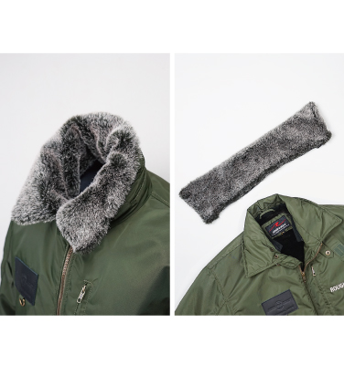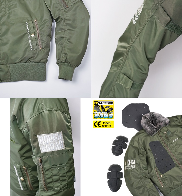 襟元のファーが特徴のB-15フライトジャケットを、ラフ&ロード流にライディングジャケットへアレンジ。B-15は、MA-1の前身モデルとして1944年に初めて採用されたフライトジャケットの原型です。表地は非常に強度の高いナイロン100%で、特徴でもあるファー付きの襟は、立てて使うことで首元の防寒性を高めるにとどまらず、取外し可能でシチュエーションに合わせた使いまわしが可能。裏地は毛足の短いファーを採用。さらに中綿入りなので暖かく防寒性にも優れています。左袖にはフライトジャケットのシンボル、ペンシルポケットを装備するユーティリティーポケット、左胸にはオリジナルにはないスマホ対応ポケットを追加しました。近代的フライトジャケットの原型となったB-15は、ライダーのニーズに応えたファンクショナルなジャケットです。MATERIAL:表地/ナイロンツイル、リブニット 裏地/フェイクファー、タフタ中綿/ウォームマックスPROTECTOR: 胸・肩・肘・脊椎パッド標準装備 (フルパット仕様)