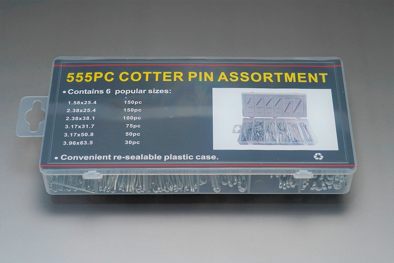 【内容】汎用性の高い割ピンのプラスチックケース入りです。汎用度の高い全6サイズ入りです。モータースポーツはもちろん、汎用機のメンテナンス時にも活躍する割ピンセットです。【製品詳細】Φ1.58×25.4mmΦ2.38×25.4mmΦ2.38×38.1mmΦ3.17×31.7mmΦ3.17×50.8mmΦ3.96×63.5mm割りピンサイズ(使用径Φ×長さmm)材質 鉄製入り数555ヶ