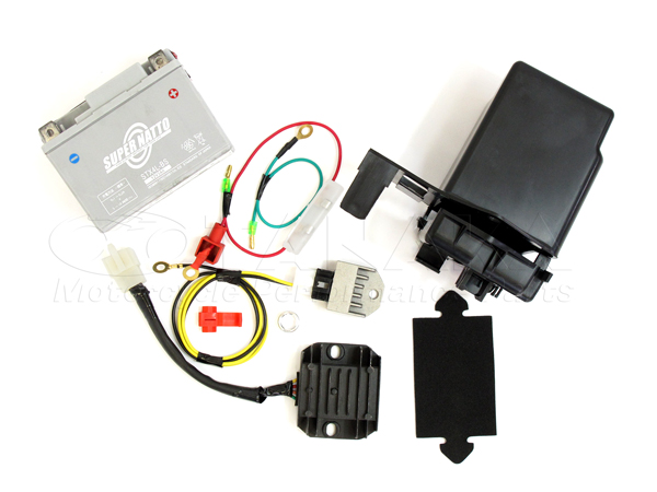 充電系回路には全波整流器を採用して、12V電源を利用したナビやUSB充電セットなどの電装系オプションに効率よく安定的に電力を供給できるようにいたしました。ヘッドライト系回路には半波整流機を採用して、35/35Wの12Vヘッドライト球へ電源を供給いたします。また、内容を簡素化し低価格での12V全波仕様にすることを目的にいたしました。電球類・12Vホーンにつきましては別途ご手配ください。バッテリーケースはこのキットでは使わず、純正のケースを利用して付属のクッションで固定いたします。【適合車種】CT110P型(オーストラリア・ニュージーランド仕様)車体番号 JH2JD01U /PK200001〜,JD01-5300001〜※POSTIEモデル・国内販売のCT110は適合不可です。【セット内容】1.レギュレーター(全波整流器)2.レギュレーター(半波整流器)3.12Vバッテリー(4L-BSタイプ)4.バッテリークッションセット5.LED専用ウインカーリレー(12.8v MAX10w)6.接続ハーネス7.バッテリー接続ハーネス1式.8.レギュレーター取り付けステー(半波整流器用)9.割り込み用エレクトロタップ(取付説明書つき) 10.専用バッテリーケース 4L-BSタイプ11.バッテリーケース用クッション※各部品は生産ロットにより形状などが異なる場合がございます。※取り付けにつきましてはオートバイ整備業者に依頼してください。【注意事項】こちらのキットはLEDウインカー専用品となります。電球バルブ(バルブタイプウインカー)をご利用の場合はCA0946Wをご購入下さい。