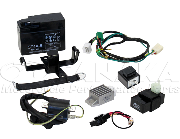 【LEDウインカー専用】6v車両に田中商会製販売の12Vエンジンを搭載する際、面倒な配線引き換え等の作業不要!既存ハーネス(純正ハーネス)に接続するだけのハーネスセットです。純正ハーネスが利用できるので、メインキーやスイッチ等もそのまま利用できます。【適合車種】モンキー・ゴリラ(一部配線の延長が必要です)等 ホンダ横型エンジン搭載6V車両(一部装着不可車両あり)※6VCDI仕様の車両には使用できません。【セット内容】専用ハーネスレギュレーターLED専用ウインカーリレー(12.8v MAX10w)CDIイグニッションコイルバッテリー(モンキー用ステー付)取説付き※12vエンジン搭載にあたり、ライトバルブ、ホーンを12v化する必要があります。【注意事項】こちらのキットはLEDウインカー専用品となります。電球バルブ(バルブタイプウインカー)をご利用の場合はCA0915をご購入下さい。