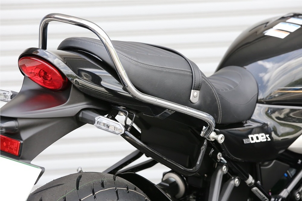 1.バッグガード本体、取扱説明書タンデムグリップ:スチール製カラー:ブラック塗装仕上げ純正LEDウィンカー、純正荷掛フック、純正リアフェンダーをそのままご使用いただけるのでライダーの五感を刺激する、美しいリアフォルムを崩すことがございません!新型"Z900RS″新型"Z900RSCAFE″の美しいトレリスフレームに合うパイプワークが魅力です!サイドバッグやソフトシェルケース等をお取付した際に、走行時ホイールや車体内側に巻き込む事を防げます!バッグやケースを取り付けていない時は"アタックバー"形状のデザインが新型"Z900RS″新型"Z900RSCAFE″の持つ潜在的な"走り"のイメージを彩ります!メーカーサイドグリップと同じく取付に際して純正パーツ No,92152-2403/荷掛対応カラ―、 No,11057-1355/荷掛対応ブラケット併用取付が可能なのでツーリングや遠乗りの際の荷作り固定能力もアップします!キジマだから出来る専用設計により、キジマZ900RS/Z900RSCAFE専用パーツキジマ品番No,315-068 Z900RS/Z900RSCAFE専用フェンダーレスキットキジマ品番No,210-5441/210-5442 キジマZ900RS/Z900RSCAFE専用タンデムグリップキジマ品番No,303-1595R キジマZ900RS/Z900RSCAFE専用ヘルメットロック右側キジマ品番No,213-4386 キジマZ900RS/Z900RSCAFE専用ステップリロケーションキットとの併用が可能です!本製品はバッグガードとなる為、タンデムライダーが足を懸けると製品の脱落に繋がる恐れがございますので、純正タンデムステップの様に荷重を懸ける使用方法はご遠慮ください。お取付箇所:純正車体サイド荷掛カラー、純正車体リアカウル荷掛フックをお取り外ししての本製品挟み込み取付となる為、ご不明な方はお近くのプロショップや車両販売店でのお取付をお勧め致します。純正シートオープナーにアクセスしやすい余裕を持たせた設計です。