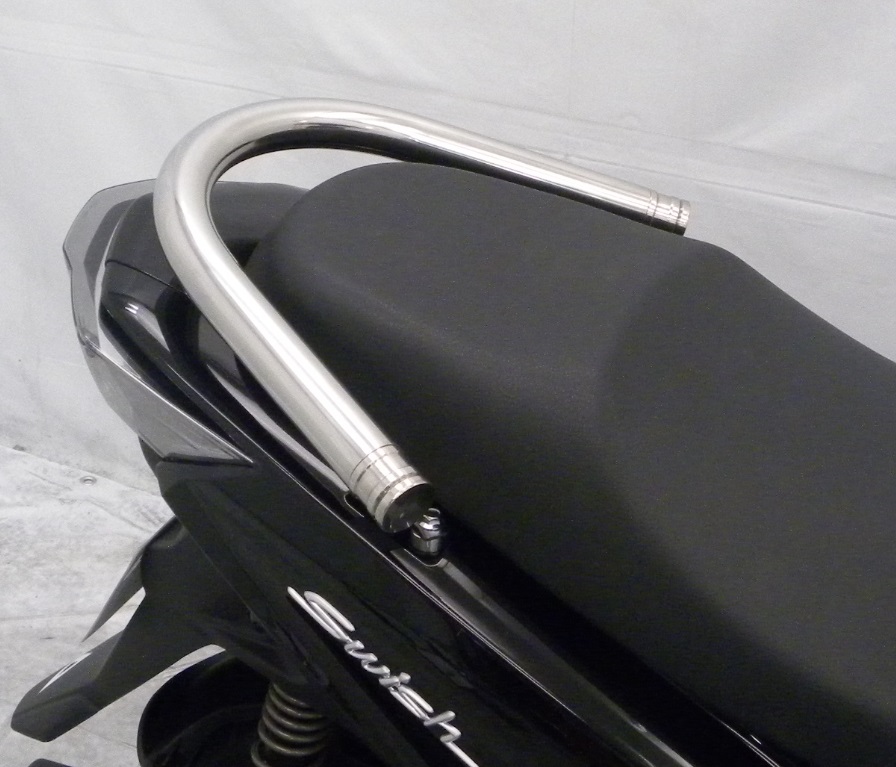 今、ローダウンはスクーターカスタムの定番となっておりますが、そのローフォルムに合わせて出来るだけ車体全体を低く見せるために、車体との一体感を追求したタンデムバーを開発いたしました!車体に沿うように低くデザインされているのでボディラインにフィットし、かつ従来品よりもさらに超極太38mm径のステンレスパイプを採用しましたので、存在感、目立ち度は抜群です!仕上げはバフ掛けを施していますので、高級感タップリでドレスアップには最適の逸品です!バーが極太なので、パッセンジャーが握りやすく力を入れやすいので、安全性も高くなっております。材質は、耐久性、耐腐食性の高いSUS304ステンレス製です。仕上げはバフ掛けを施していますので、高級感タップリでドレスアップにも最適の逸品です!また、タンデムバーを取り付けるために一部ボディパネルを取り外す必要がありますが、外した後の目隠し用プレート(ステンレス製 鏡面仕上げ)が付属しておりますので、違和感なく取り付けられるようになっております。