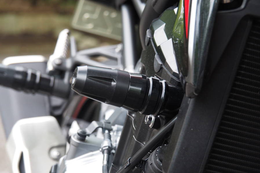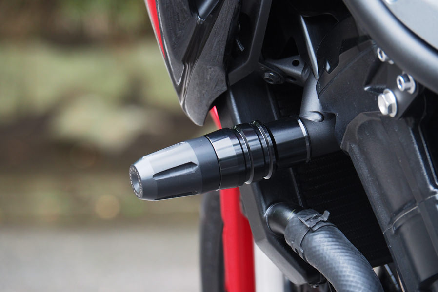 エンジンガードはマウントボルトを交換して装着します。車体からしっかりと外に張り出すので立ちゴケや軽度の転倒事故の際に車体に与えるダメージを軽減します。※転倒の仕方や事故の内容によってはダメージが大きくなる可能性もございます。本体:アルミ・ブラックアルマイト仕上げパッド部分・樹脂製