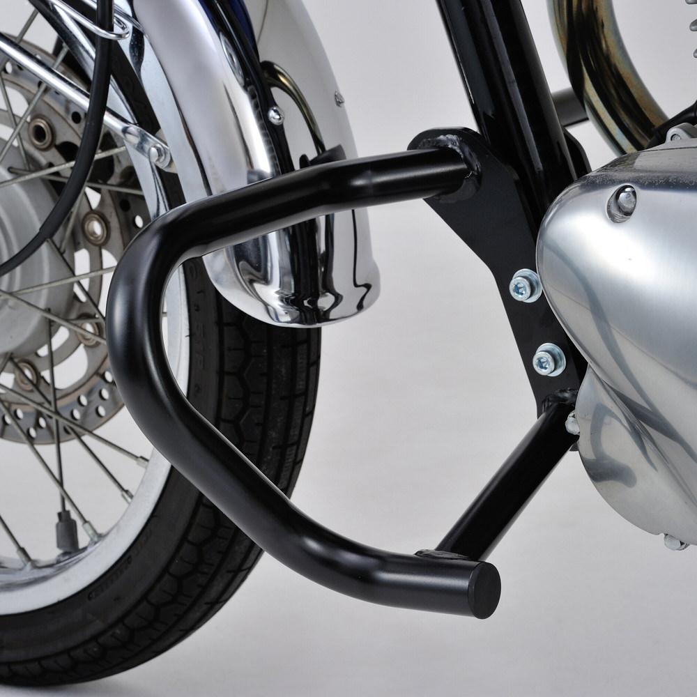スチールパイプ製のエンジンガード。ボルトオン装着可能。立ちゴケ等の軽度な転倒に対し、エンジンやカウルのダメージを軽減。パイプ径はクルーザーモデル等のハンドルと同径の1インチ(φ25.4)なので、アクションカメラなどハンドルにクランプする用品の装着も可能。・装着時最大幅:544mm。・左右分割タイプ。・スチール製マットブラック塗装仕上げ。※過度な転倒時には商品が破損する恐れがあります。※本商品はマットブラック塗装のため、飛び石やバイク保管用保護カバーとのすれ等で塗装がはがれる場合があります。※樹脂パッド(リダクションスライダー)は付属しません。