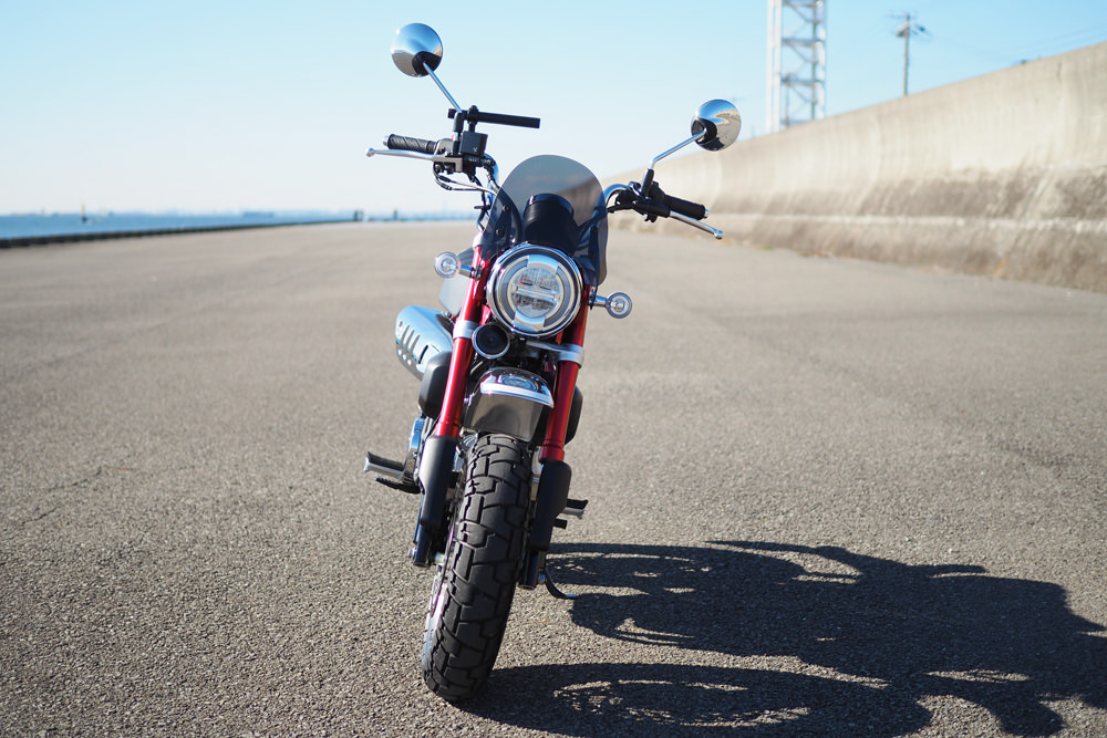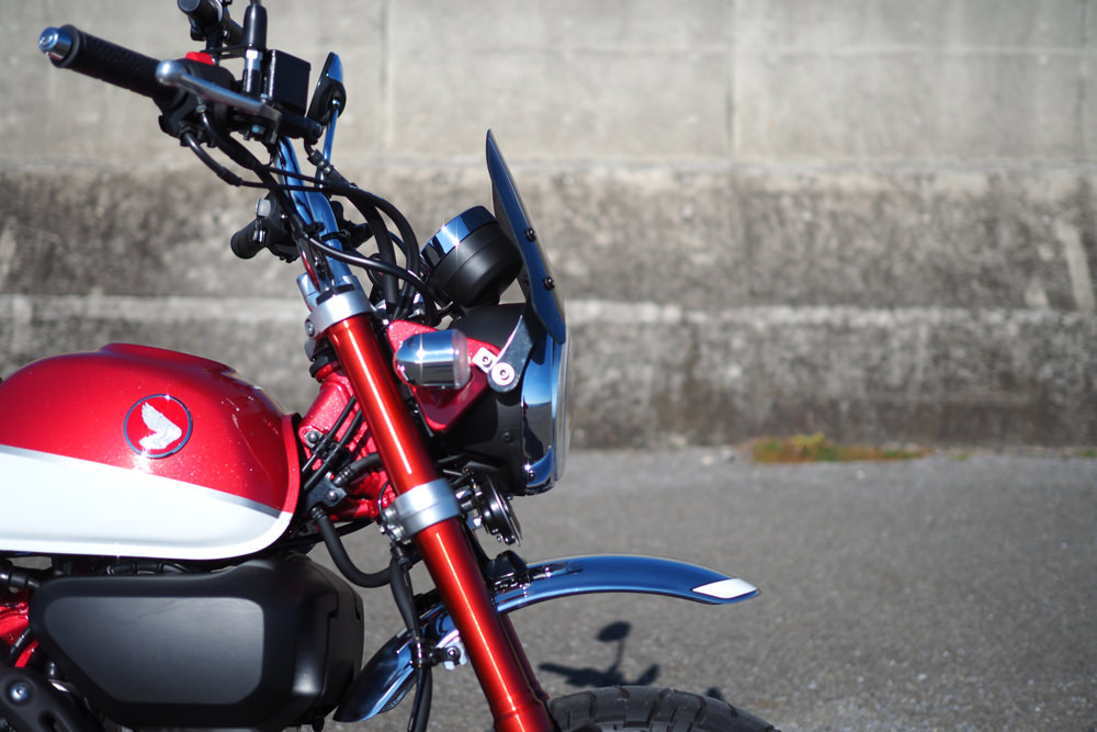 スクリーン本体:アクリル スクリーン用ステー・取り付けボルト:スチール黒塗装 スクリーンマウントステー・取り付けボルト:ZAM鋼板・ステンレスこちらの製品はスクリーンサイズ ショート・カラーはスモークですショート:縦230mm×横230mmヘッドライトリム部分にきれいに沿うようなデザインを採用した事でバイクとの一体感を生みだします。モンキー125のスクリーンをマウントするステーは溶融亜鉛Zn-アルミニウムAl-マグネシウムMg合金めっき鋼板・ZAMを採用しています。耐食製に優れており赤錆などの発生も一般的なスチール材と比べて発生しにくい素材です。また装着を簡単にするために圧入ナットを採用しました。スクリーンを装着する際にナット側に工具をかける必要がないため装着を容易にします。モンキー125用メーターバイザーは「更に」モンキー125の走行を楽にする為の装備というコンセプトで作りました。モンキーというと「カスタム」というイメージがありますが快適装備を身に纏い下道ツーリングをガンガン楽しみたいユーザーにオススメのメーターバイザースクリーンです。