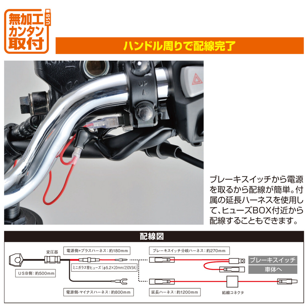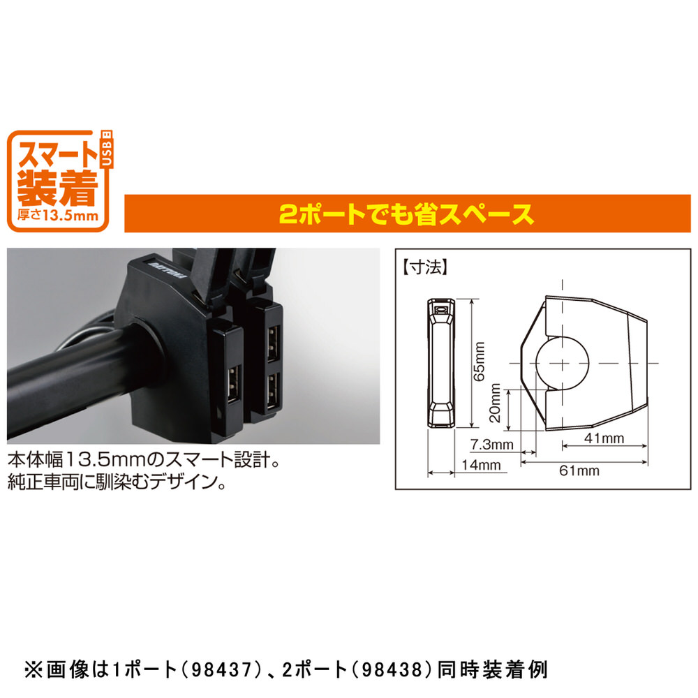 ※ご注意※本品は1ポートの商品となります。画像中に2ポートの商品と同時装着した画像がございますが、こちらの商品は1ポートのみの商品となります。ご注意くださいませ。厚さ13.5mmのスリムなUSB電源。1ポートあたり5V/2.4Aの高出力仕様。配線はブレーキスイッチから電源を取るだけの簡単仕様。付属の延長ハーネスを使用すれば、ヒューズBOX付近からも配線可能。ハンドルクランプはφ22.2mm/φ25.4mm対応。意匠登録商品。●1ポートMAX5V/2.4Aの高出力。●ブレーキスイッチに接続することで、メインキーと連動してON/OFF。●ブレーキスイッチに接続できない車種でも、付属の延長ハーネスを使用して、ヒューズBOX付近から配線することもできます。●コントロールスイッチに似合うスリムなスレンダースイッチの意匠を採用。●簡易防水仕様。※セパレートハンドル車のコントロールスイッチ付近は、装着スペースを確保できないことがあります。※洗車の際は、本品へ水を直接かけないでください。※バッテリー上がり防止のため、配線をメインキーと連動させるか、別途スイッチを設置ください。