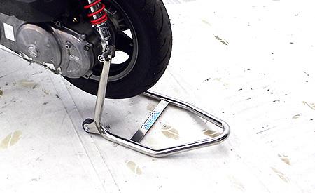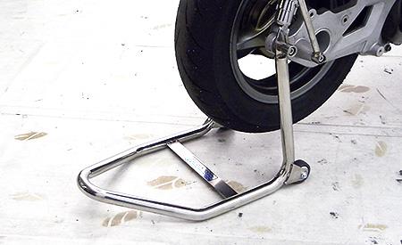 レースシーンからのフィードバック商品で、純正スタンドを取り外してしまうレース車両には必須アイテムです。レース活動ではすでに大活躍の商品で、大変助けられています。支点となる部分にローラーを装備していますので、ローラー無しタイプに比べて格段にスタンドを掛けやすく、安定しているので整備作業も安心して行うことが出来ます。