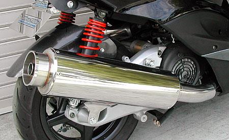 ※平成22年4月1日より施行された認証制度に適合する認証マフラーではありません。ご理解の程よろしくお願い致します。サイレンサーには大容量、大迫力の120mm径×400mmのステンパイプを採用。ボリュームがありますので存在感は圧巻です!サイレンサー出口とエキパイ接続部分には、ステンレスを削りだした部材を使用し、高級感抜群の仕上がりとなっております。エキパイ部分は2段階に太くなり、最終的にサイレンサーの迫力にマッチする60mm径のステンレスパイプで仕上げました。車体のラインに調和するようにサイレンサーの位置を吟味し、あらゆるカスタムに似合うようシンプルながら高級感をイメージし、たくさんの方々からの意見を取り入れ製作しました。音量、音質にもとことん拘って、何本ものテスト品の中からベストな構造を導き出して完成させました。うるさすぎず静かすぎず、歯切れの良い重低音サウンドを醸し出します。バッフル(消音用のパーツ)を標準装備しておりますので、簡単な作業で2種類の音量が選択できます。性能面でも低中速の落ち込みをなくしスムーズな走行を実現させています。ローダウン車にも対応しておりますが、極端にローダウンしている車両(30mm以上ダウン、大きめのサイドカウル装着車)は、マフラーとボディが干渉する恐れがありますので、購入・装着にはご注意ください。本品はエキパイにO2センサー取付け口が装備されていない、シグナスX SE44J 28S 用 のマフラーになります。【音量】バッフル装着時:86dbバッフル非装着時 :88db