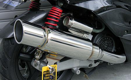※平成22年4月1日より施行された認証制度に適合する認証マフラーではありません。ご理解の程よろしくお願い致します。マフラー選びでお悩みの方、まずはこのマフラーからいかがでしょうか?デザインは幅広い層に気に入って頂けるよう、車体のラインに調和するようにサイレンサーの位置を吟味し、あらゆるカスタムに似合うようにシンプルながら高級感溢れるマフラーに仕上げました。サイレンサー出口には、内側にカールしたカールエンドタイプを使用しています。サイレンサーは大きすぎず小さすぎないバランスの良い115mm径を採用しました。音量、音質にもとことん拘って、何本ものテスト品の中からベストな構造を導き出して完成させました。うるさすぎず静かすぎず、歯切れの良い重低音サウンドを醸し出します。バッフル(消音用のパーツ)を標準装備しておりますので、簡単な作業で2種類の音量が選択できます。性能面でも低中速の落ち込みをなくしスムーズな走行を実現させています。ローダウン車にも対応しておりますが、極端にローダウンしている車両(30mm以上ダウン、大きめのサイドカウル装着車)は、マフラーとボディが干渉する恐れがありますので、購入・装着にはご注意ください。本品はエキパイにO2センサー取付け口が装備されていない、シグナスX SE44J 28S 用 のマフラーになります。【音量】バッフル装着時:88dbバッフル非装着時 :92db※画像中のインジェクタータンクは本商品には含まれません。