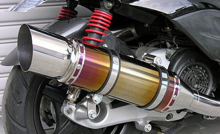 ※平成22年4月1日より施行された認証制度に適合する認証マフラーではありません。ご理解の程よろしくお願い致します。サイレンサーメインパイプにレインボーカラーの焼き色を施したチタンパイプを採用しました。ステンレス製のバンド2本で車体に固定します。サイレンサーの両端末には、エッチング加工のエンドバンドを使用し、細かい箇所でドレスアップ演出を施しています。また、エキパイとサイレンサーのエキパイのジョイント部には、スムーズなラインを出すためにテーパー加工設計にしています。幅広い層に気に入ってもらえるよう、シンプルで高級感溢れるマフラーに仕上げました。車体のラインに調和するようにサイレンサーの位置を吟味し、あらゆるカスタムに似合うようシンプルながら高級感をイメージし、たくさんの方々からの意見を取り入れ製作しました。これ以上にない完成度です。音量、音質にもとことん拘って、何本ものテスト品の中からベストな構造を導き出して完成させました。うるさすぎず静かすぎず、歯切れの良い重低音サウンドを醸し出します。バッフル(消音用のパーツ)を標準装備しておりますので、簡単な作業で2種類の音量が選択できます。性能面でも低中速の落ち込みをなくしスムーズな走行を実現させています。ローダウン車にも対応しておりますが、極端にローダウンしている車両(30mm以上ダウン、大きめのサイドカウル装着車)は、マフラーとボディが干渉する恐れがありますので、購入・装着にはご注意ください。サイレンサーメインパイプ以外はSUS304ステンレス製です。 本品はエキパイにO2センサー取付け口が装備されていない、シグナスX SE44J 28S 用 のマフラーになります。【音量】バッフル装着時:87dbバッフル非装着時 :91db