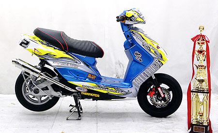 ※平成22年4月1日より施行された認証制度に適合する認証マフラーではありません。ご理解の程よろしくお願い致します。2010年サーキット秋ヶ瀬にて開催されたモトチャンプ杯ミニバイクレース全国大会のFP4クラスに参戦し、強豪がひしめく中で見事に優勝して日本一の称号を獲得し、さらに関西モトチャンプ杯ミニバイクレースでもシリーズチャンピオンを獲得したマフラーと、全く同じ仕様の最強最速マフラーです。マフラーの開発は、ウイルズウィンが誇るイケメンワークスライダー長谷部選手が自ら走行テスト、開発を行ない、そのインプレッションを元に製作した究極のレーシングマフラーです。バンク角、音量、性能、強度、耐久性を追求して製作しています。『マフラーでここまで変わるのか?!』と言ってしまうほど速くなります。レーシングマフラーGには ハイパーセンタースプリング が付属されていますので、取り付けるだけですぐにレースで戦える状態になります。また、WirusWin製ハイパー駆動系キット装着でさらに性能をアップできます。レーシングマフラーGは、サポートライダーが現状で最高と判断してレースで使用したそのままの仕様を市販化しています。レースで使用した先行開発タイプと市販タイプとの区別をする事無く、現状で最高と判断した仕様を即時フィードバックして製品としておりますので、バイクの仕上がりとライダーの腕次第で十分にトップ争いが可能です。音量はレース規定の規制値音量内に設定していますので、安心して実戦投入が可能です。装着はステーを固定し、サイレンサーをバンドで止めてエキパイをエンジン側に固定するだけですので簡単に取り付けできます。なお、レーシングマフラーGは更なる性能追求のための改良を常時続けていますので、予告無く仕様変更が施される場合がある事を予めご了承ください。材質はサイレンサーボディは軽量で剛性の高いチタンを使用しています。エキパイ、サイレンサー内部は耐久性、耐腐食性の高いステンレス製です。本品はエキパイにO2センサー取付け口が装備されていない、シグナスX SE44J 28S 用 のマフラーになります。