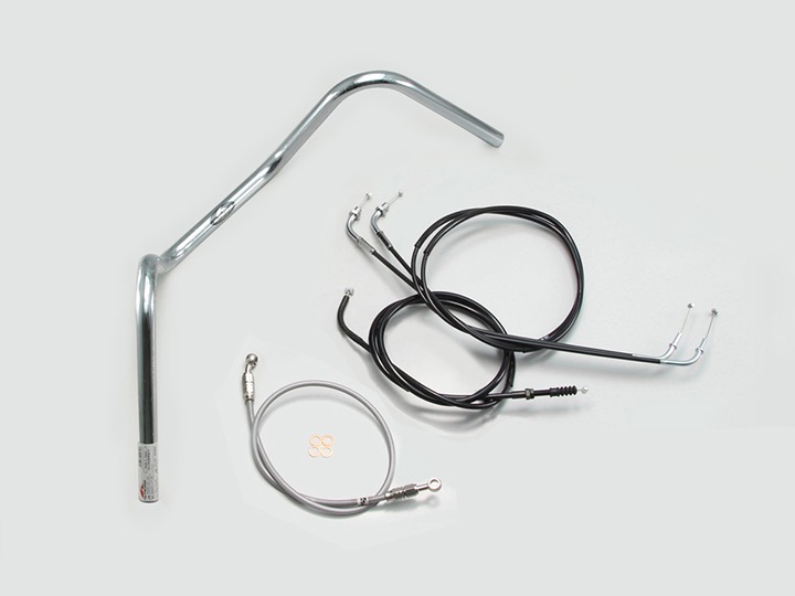 ハンドルと交換に必要なケーブル&ホースSET付属:スロットルケーブル・クラッチケーブル・ブレーキホース別途ハーネスの延長が必要になります。別途ハンドルの穴開け加工が必要となります。別途サイドキャップ(内径φ18mm)が必要