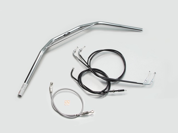 ハンドルと交換に必要なケーブル&ホースSET付属:スロットルケーブル・クラッチケーブル・ブレーキホース別途ハンドルの穴開け加工が必要となります。別途サイドキャップ(内径φ18mm)が必要
