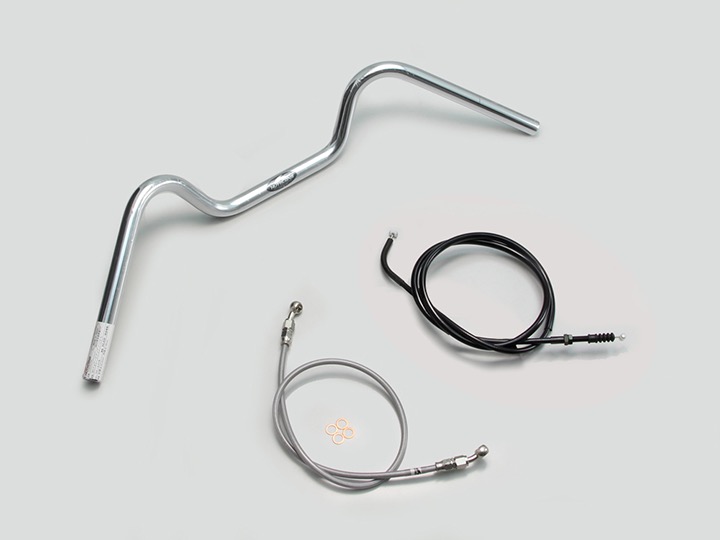 ハンドルと交換に必要なケーブル&ホースSET付属:クラッチケーブル・ブレーキホース別途ハンドルの穴開け加工が必要となります。別途サイドキャップ(内径φ18mm)が必要