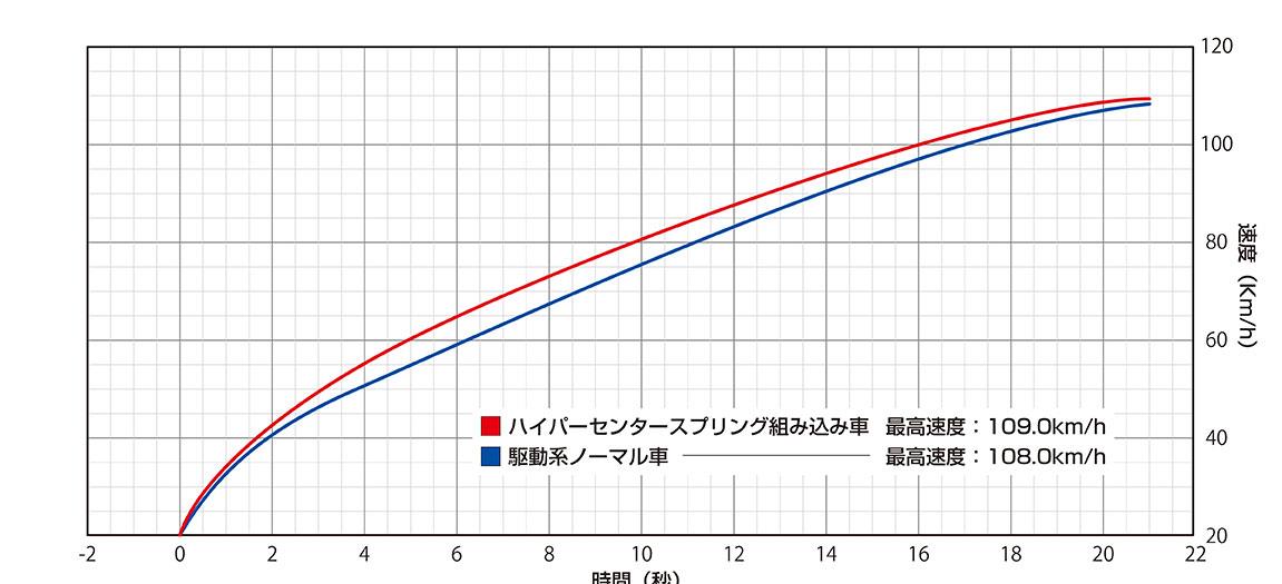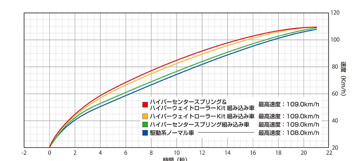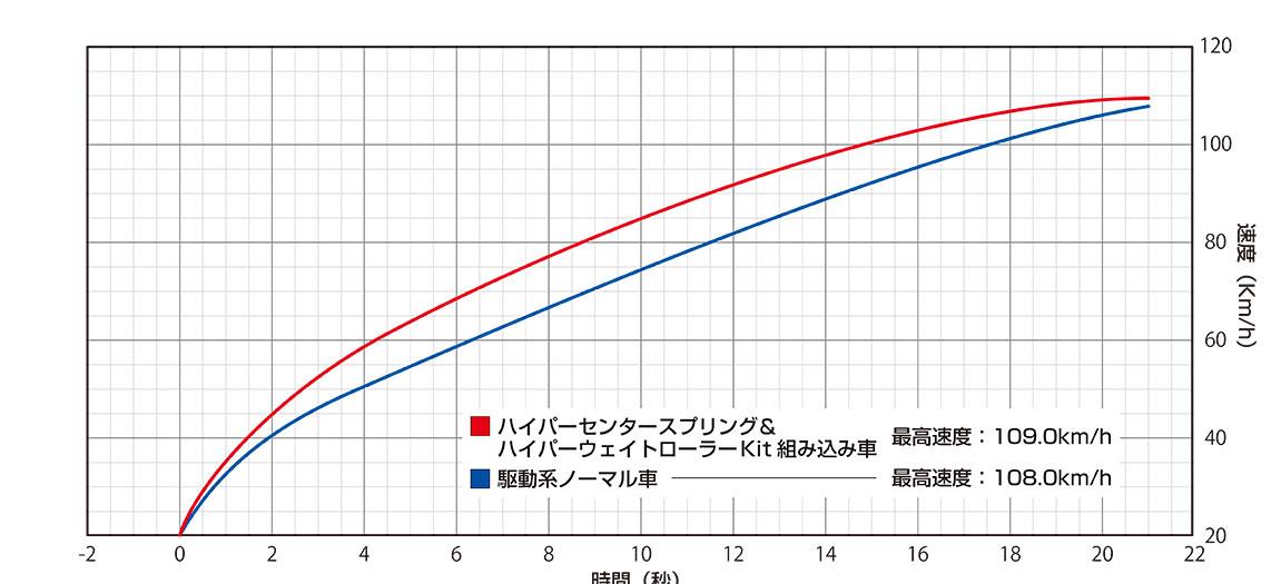 WirusWin製ハイパーウェイトローラーKitと純正ウェイトローラーとの速度比較グラフでは、WirusWin製ハイパーウェイトローラーKitの方がゼロ発進時の速度の立ち上がりが抜群に良く、その差が最高速到達まで続き、結果、最高速到達時間が大幅に短縮されている事が分かります。
