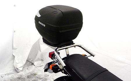 SHAD(シャッド)社 製リアボックス【 SH29 】(サイズ:380mm (L) x 400mm (W) x 300mm (H)・本体重量:約2.6kg・容量:29L)を装備したタンデムバーです。リアボックスと、タンデムバーの同時装着を可能にしたニューアイテムです。リアボックスは車種よっては加工や専用ステーを別途購入しないと取り付けできませんが、タンデムバーにリアボックス用ベースブラケットを融合する事によって無加工で装着できるようにしました。タンデムバーはバランスの良い32mm径を採用。パッセンジャーが握りやすく力を入れやすいので、安全性も高くなっております。リアボックスのスペックはディフューザーダクトなどの付加物のある大きめのフルフェイスのヘルメットが1個と、グローブなど+αが収納できるサイズで最大積載量は3kgです。材質は無塗装ブラックの材質PP(ポリプロピレン)で、丈夫な作りになっています。開閉はレバーを押すだけで簡単にできます。付属のキーでロックも可能。リアボックスの取り外しはレバーを押すだけで簡単に脱着でき、持ち運びが簡単にできるのでいたずらや盗難から大切な荷物を守る事ができます。タンデムバーの材質は、耐久性、耐腐食性の高いSUS304ステンレス製です。仕上げはバフ掛けを施していますので、高級感タップリでドレスアップにも最適の逸品です!デザインカスタム重視の方、タンデムが多い方などに特にオススメです。リアボックス用ベースブラケットには、GIVI(ジビ)社 製、COOCASE(クーケース)社 製リアボックスのベースを取り付ける専用穴も開いていますので、それぞれのリアボックスもボルトオンで取り付け可能です。(穴あけ加工が必要な場合がございます。)その他汎用リアボックスも取り付け穴を利用して取り付けできます。
