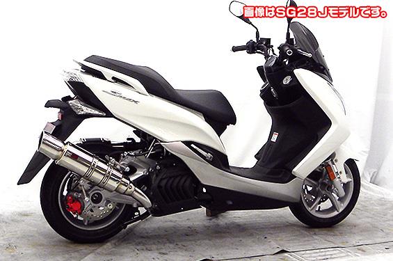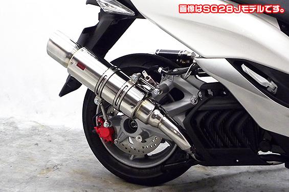 ※平成22年4月1日より施行された認証制度に適合する認証マフラーではありません。ご理解の程よろしくお願い致します。サイレンサーは新設計構造を採用し軽量化を図っています。出口はインナーカールエンドタイプで、厚みのある上品な仕上がりになっています。サイレンサーバンドにはスリットタイプを採用してデザインにもこだわっており、従来のステーの固定からサイレンサーバンドで固定することにより、車体と調和したニュースタイルのマフラーを完成させました。某有名マフラーメーカの製作になりますので、低価格ながら完成度は非常に高い作りになっています。オールSUS304ステンレス製で、エキパイからサイレンサーまでバフ仕上げを施しています。ビッグスクーターにマッチするようエキパイ径60mm、サイレンサー径125mmの仕様で、装着時の全体的なバランスがとれた仕上がりとなっています。低中速を落とすことなく高回転でスムーズに回り扱いやすい設定になっています。振動防止のためサイレンサーとエキパイが2分割となる安心設計になっています。サイレンサーは、2点止めになっていますのでしっかりと固定でき、耐久性にも優れています。無加工ボルトオンにて装着できますので、必要な工具があれば簡単に取り付けできます。(取り付けに必要なボルト類は全て付属しております。)サイレンサーはストレート構造ではなくフロント部にパンチングを施した作りになっていますので、音量は静かめに抑えられており近所迷惑になる事無く安心して走行できます。バッフル装着時 約88db(法定規制値内音量)、バッフル非装着時 約92db になります。音質も耳障りな音でなく重低音のサウンドになっていますので、ノーマルマフラーではちょっと物足りない方にオススメです。ローダウンにも対応しておりますので、安心してご使用下さい。